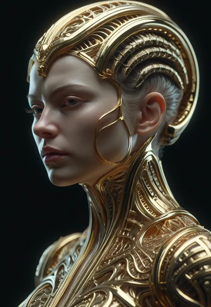 mdjrny-v4 style , symmetric , intricate , centred 3d render ultra detailed of a beautiful porcelain and gold profile portrait woman , 150 mm , beautiful studio soft light , rim light , vibrant details , luxurious antic , hyperrealistic , anatomical , facial muscles , blade runner atmosphere , elegant , octane render , H. R. Giger style , 8k ,