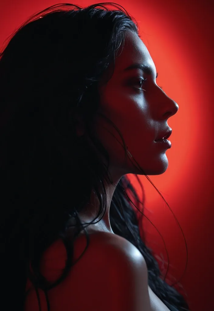 profile angle of A mystical woman's face , partially obscured by flowing raven hair , is captured in a fashion editorial style. Her eyes gleam with an intense , life-like shine against a deep , velvety red background. Professional photography captures the scene with a cinematic angle , utilizing dynamic backlighting to accentuate her features and create a halo effect. Rendered in hyperrealistic detail with a high-resolution finish , evoking the dramatic lighting and sharp focus of a modern magazine cover. ar-9:16 ,