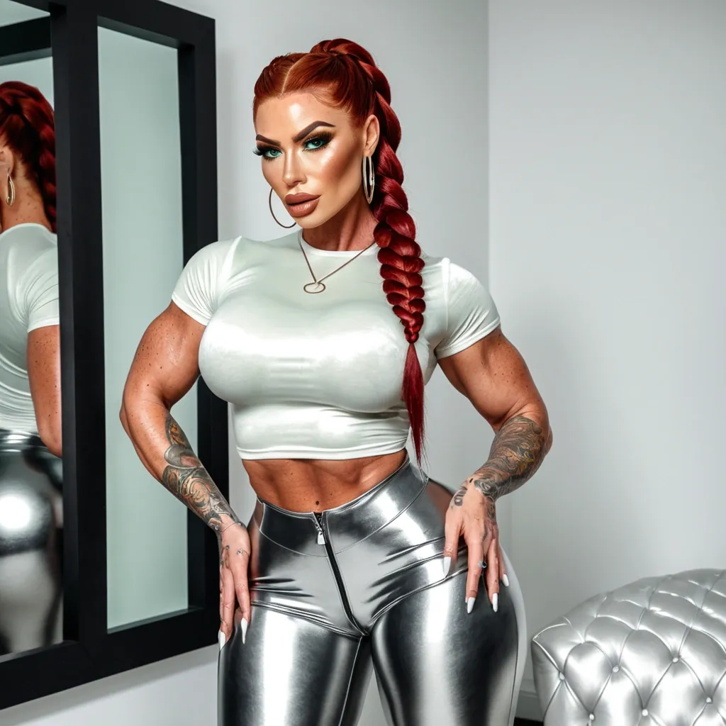 Generate Gorgeous female boss , bimbo , hourglass body , abnormally massive female bodybuilder , gorgeous , close up , full lips , big booty , redheaded , freckles on face and breast , braided design hair , feminine silhouette , too big breast , big booty , sexy thighs abs , silhouette , up close , flexing biceps , beautiful green eyes , legs are iconic and defining physical feature , both visually and in terms of combat ability.wearing an outfit that is a striking blend of elegance , power , and femininity , designed to command attention in any room. The suit is tailored to perfection , hugging the wearer’s curves with precision while emphasizing a structured silhouette. The fabric itself is a refined grey tweed patterned with subtle white grid lines , giving the suit a texture that feels both sophisticated and modern. The blazer features broad blue lapels and gold button accents , adding a luxurious touch that elevates the look beyond typical business attire. The matching high-waisted trousers elongate the frame , further enhancing the poised and commanding effect of the ensemble.The styling choices amplify the boldness of the suit. The inner blouse is a silky , greybutton-down shirt that complements the tweed’s tone while introducing a softer , feminine balance to the sharp tailoring of the jacket. The blouse peeks out neatly from under the blazer , maintaining elegance without drawing focus away from the suit’s commanding cut. Accessories are kept minimal yet intentional: a delicate layered gold necklace and hoop earrings that add glimmers of light and luxury without overpowering the outfit. The choice of voluminous , honey-brown braids cascading down her shoulders frames the face with both confidence and glamour , completing the commanding visual.Altogether , this look communicates a blend of authority and allure. It is business-ready yet fashion-forward , balancing corporate structure with vibrant femininity. The color palette blue , grey and gold avoids being overly delicate , instead embracing the richness of texture , structure , and presence. This is the kind of ensemble that speaks to ambition , sophistication , and personal style—ideal for someone who thrives in positions of influence but insists on expressing her individuality with bold elegance. It’s not just clothing—it’s a statement of power wrapped in grace. In luxury living legs that could crush a watermelon , skirt high boots are a bold and striking statement piece , crafted in glossy black patent leather that gives them a sleek , polished finish. Rising to just below the knee , the boots feature three adjustable buckle straps along the shaft , adding both edge and detail to their design. The towering stiletto heel , paired with a thick platform sole , creates an ultra-dramatic silhouette that elongates the leg and exudes power and confidence. With their combination of shine , height , and structure , these boots perfectly balance fierce femininity with high-fashion allure. Freckles gorgeous green eyes , eggshell white elegant classy velvet t-shirt and silver necklace , black leather pants , full body shot , enormous butt ,