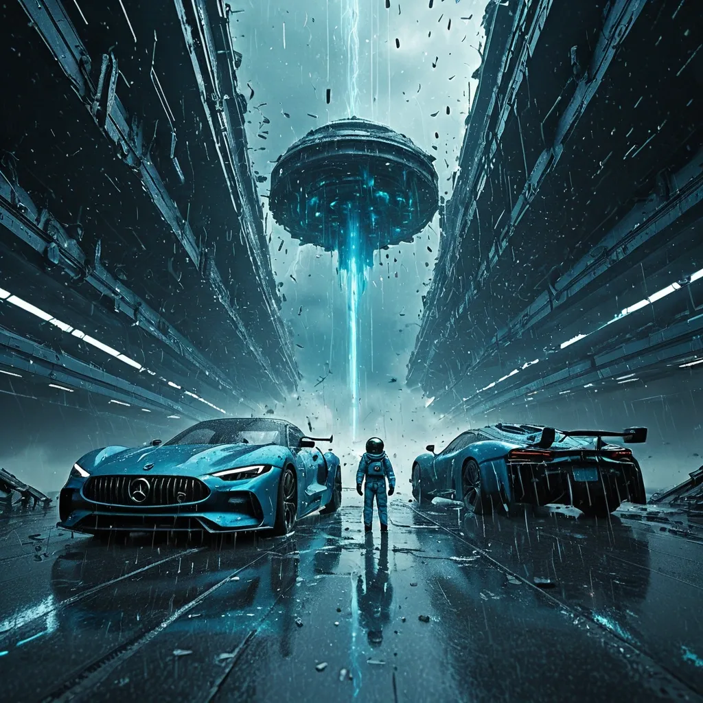 A rain , dust , and rise from the ground in vortex fragments , suspended within the turbulence , fantastical space station reimagined in an Analog-Digital Hybrid Decay , fly across a sky abyss like a hole peeking through the crack in the clouds , dark indigo and light cyan , realistic hyper-detail , fluid simplicity. space city and in front a astronaut of Ancient migrate with their robots and belongings , and in front of them is a sport-car appears from storm , rain's drops in motion , sharp focus , realistic hyper-detail , fluid simplicity --ar 128:63 --stylize 750 --v 6 , ,