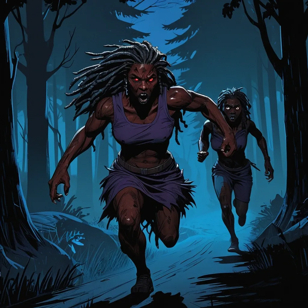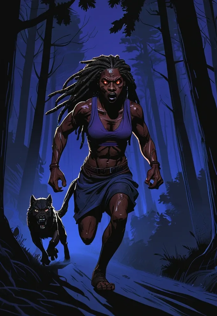 Upon discovering she is being hunted by vampires , a strong , imposing werewolf with dark skin , dreadlocks , and wolf-like eyes races to her rescue , running towards her home. This illustration is rendered in a graphic novel style , with bold lines and dramatic shadows , reminiscent of Artstation illustrations. He is running at full speed through a dark forest , his expression determined and fierce. Some members of his pack are running alongside him , their eyes glowing in the darkness. The trees blur past them as they push themselves to their limits. The overall color palette is dark and urgent , with deep blues , purples , and reds dominating , emphasizing the urgency and danger of his mission. ,