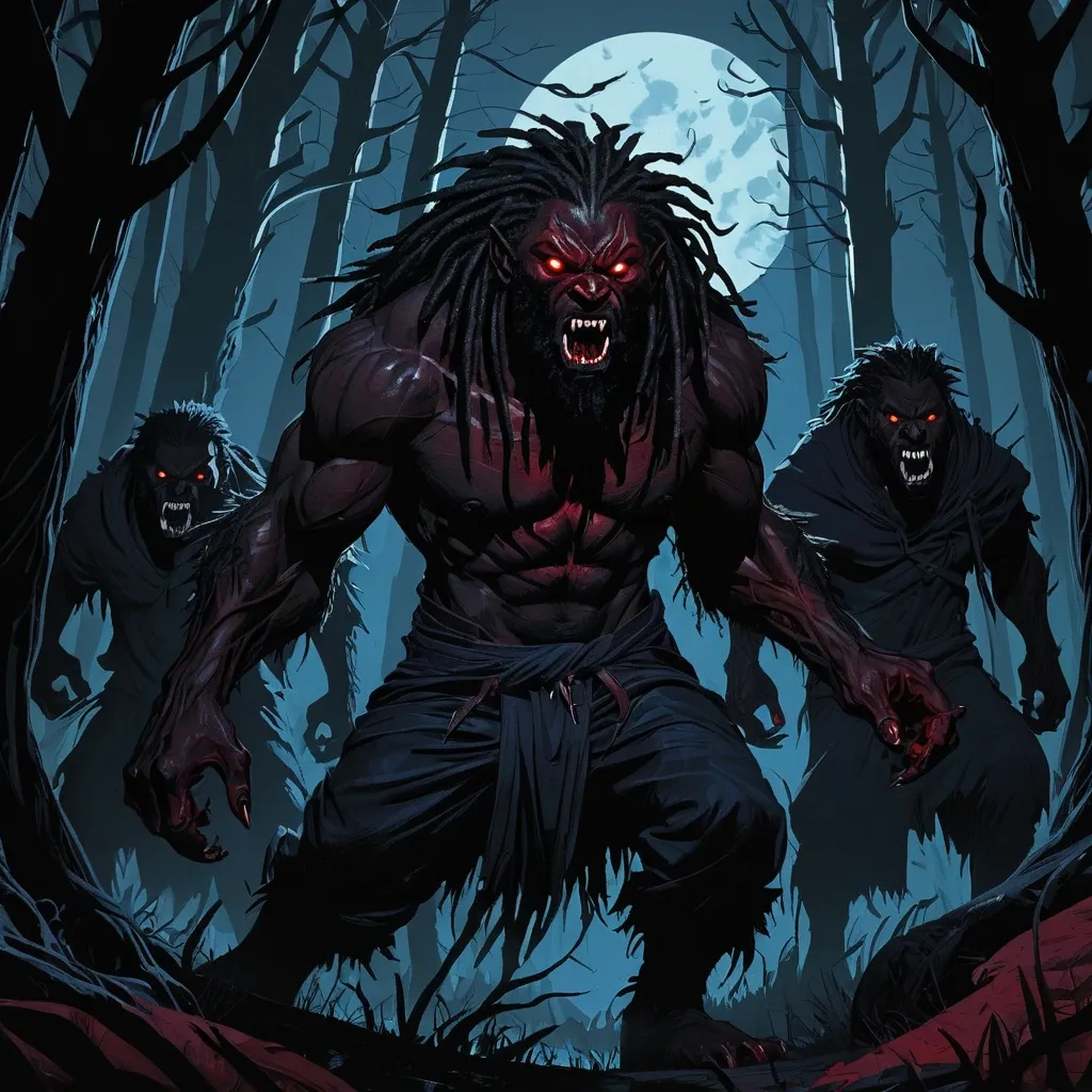 A strong , imposing werewolf with dark skin , dreadlocks , and wolf-like eyes is hunted through a dark forest by a group of vampires. This illustration is rendered in a graphic novel style , with bold lines and dramatic shadows , reminiscent of Artstation illustrations. The vampires are relentless in their pursuit , their eyes glowing red in the darkness. The trees are gnarled and twisted , adding to the sense of danger and unease. The overall color palette is dark and oppressive , with muted blues , purples , and blacks dominating , emphasizing the werewolf's vulnerability and the vampires' predatory nature. ,