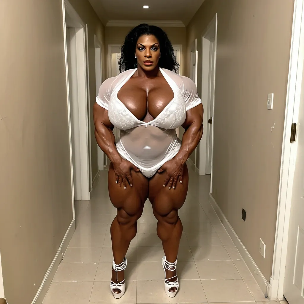 À african giant muscular chubby femalebodybuilder , housewife woman BBW musclée , heavy weight bodybuildeuse géante et plantureuse with giant chest , imposante dame massive , beautiful make up Phylicia Rashad face , in a home corridor , avec de gros seins , énormes biceps musclés , in white laces transparent short mini loose nightgown with heels , exposant les seins , bras musclés exposés , dominante , jambes massives exposées , agressive , ,
