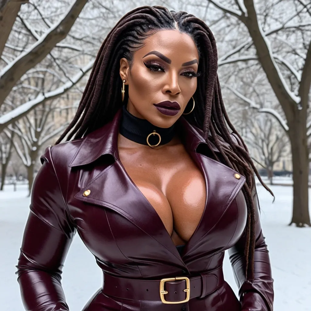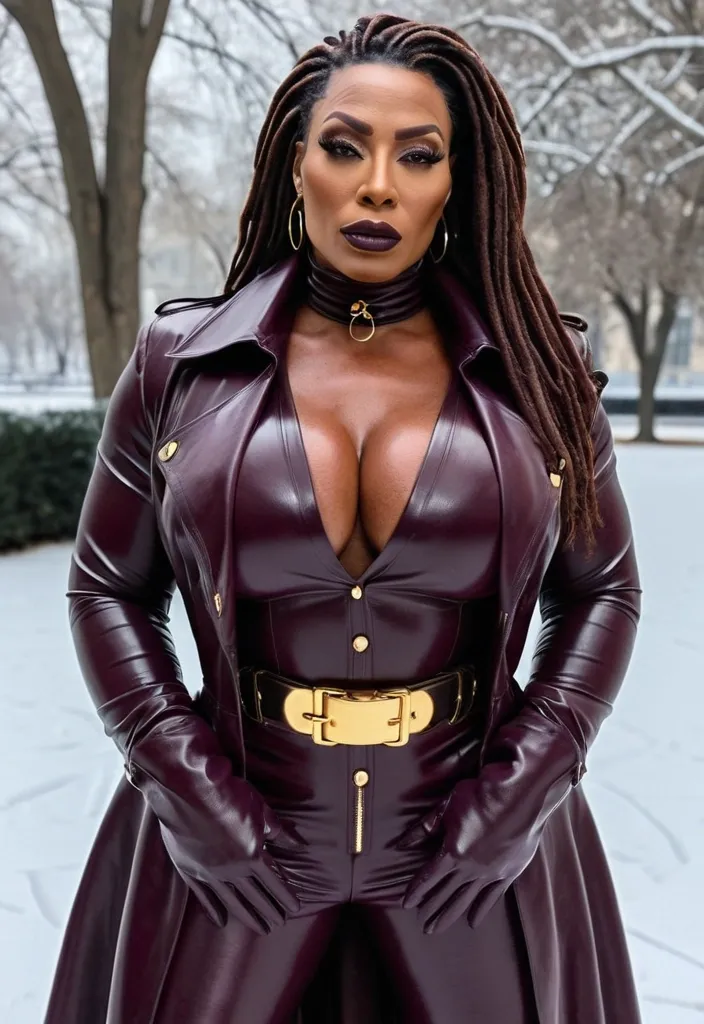 Generate Gorgeous 42 years old , female boss , dark-skinned African-American woman , bimbo , hourglass body , abnormally massive female bodybuilder , gorgeous , close up , full lips , big booty , brown , dreadlocks , feminine silhouette , too big breast , big booty , sexy thighs abs , silhouette , up close , flexing biceps , gorgeous brown eyes , legs are iconic and defining physical feature , both visually and in terms of combat ability.wearing an outfit that is a striking blend of elegance , power , and femininity , designed to command attention in any room. The suit is tailored to perfection , hugging the wearer’s curves with precision while emphasizing a structured silhouette. The fabric itself is a refined grey tweed patterned with subtle white grid lines , giving the suit a texture that feels both sophisticated and modern. The blazer features broad blue lapels and gold button accents , adding a luxurious touch that elevates the look beyond typical business attire. The matching high-waisted trousers elongate the frame , further enhancing the poised and commanding effect of the ensemble.The styling choices amplify the boldness of the suit. The inner blouse is a silky , greybutton-down shirt that complements the tweed’s tone while introducing a softer , feminine balance to the sharp tailoring of the jacket. The blouse peeks out neatly from under the blazer , maintaining elegance without drawing focus away from the suit’s commanding cut. Accessories are kept minimal yet intentional: a delicate layered gold necklace and hoop earrings that add glimmers of light and luxury without overpowering the outfit. The choice of voluminous , honey-brown braids cascading down her shoulders frames the face with both confidence and glamour , completing the commanding visual.Altogether , this look communicates a blend of authority and allure. It is business-ready yet fashion-forward , balancing corporate structure with vibrant femininity. The color palette blue , grey and gold avoids being overly delicate , instead embracing the richness of texture , structure , and presence. This is the kind of ensemble that speaks to ambition , sophistication , and personal style—ideal for someone who thrives in positions of influence but insists on expressing her individuality with bold elegance. It’s not just clothing—it’s a statement of power wrapped in grace. In luxury living legs that could crush a watermelon , skirt high boots are a bold and striking statement piece , crafted in glossy black patent leather that gives them a sleek , polished finish. Rising to just below the knee , the boots feature three adjustable buckle straps along the shaft , adding both edge and detail to their design. The towering stiletto heel , paired with a thick platform sole , creates an ultra-dramatic silhouette that elongates the leg and exudes power and confidence. With their combination of shine , height , and structure , these boots perfectly balance fierce femininity with high-fashion allure. High cheekbones , prominent jawline , gorgeous big brown eyes , , enormous breast , She is wearing a long , form-fitting dark burgundy leather trench coat that is a button up velvet violet collard shirt paired with gloves violet leather , a gold belt , and grey pants , outside in the snow in a beautiful park gorgeous brown eyes , closed collar black turtleneck oxford t-shirt , , modest closed torso t-shirt. White t- shirt ,