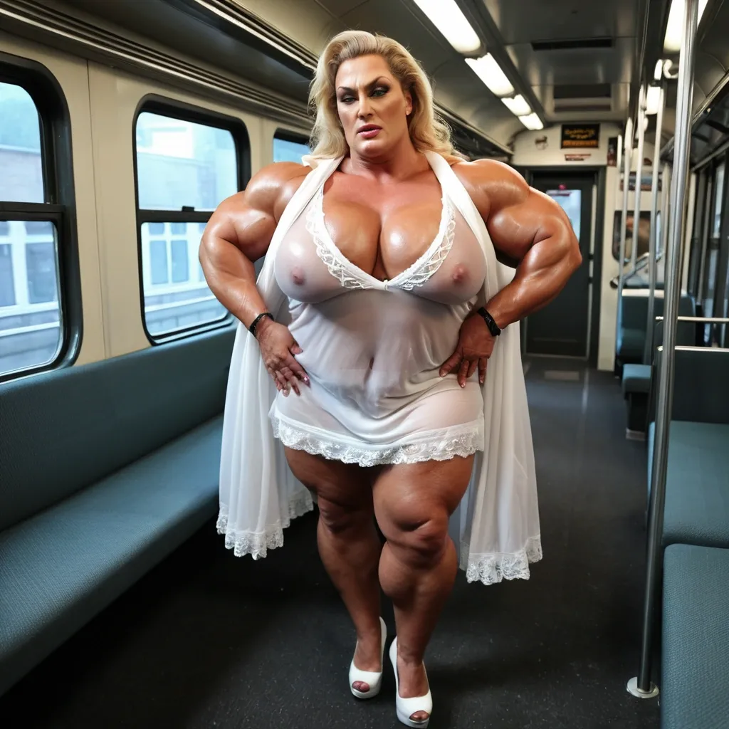 À giant muscular chubby femalebodybuilder , housewife woman BBW musclée , heavy weight bodybuildeuse géante et plantureuse with giant chest , imposante dame massive , beautiful make up Meryl Streep face , in a train , avec de gros seins , énormes biceps musclés , in white laces transparent very short mini loose nightgown with heels , exposant les seins , bras musclés exposés , dominante , jambes massives exposées , agressive , ,