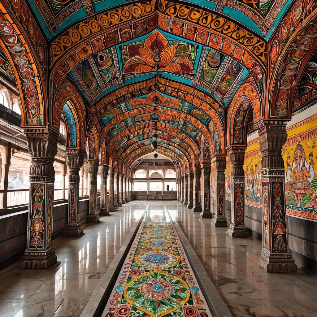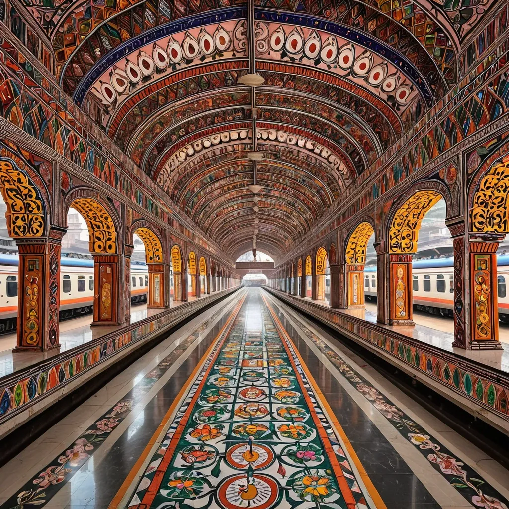 The interior design of the Railway station is a stunning blend of Lord Krishna and Vrudavan influences from Mathura. Every corner of Railway station exudes vibrant patterns and colors reminiscent of traditional Madhubani paintings. In this breathtaking painting , intricate batik motifs intertwine with the intricate geometric shapes of leafs , creating a mesmerizing display of cultural richness. The image captures the essence of Indian heritage in every meticulous detail , making it a truly captivating work of art. ,