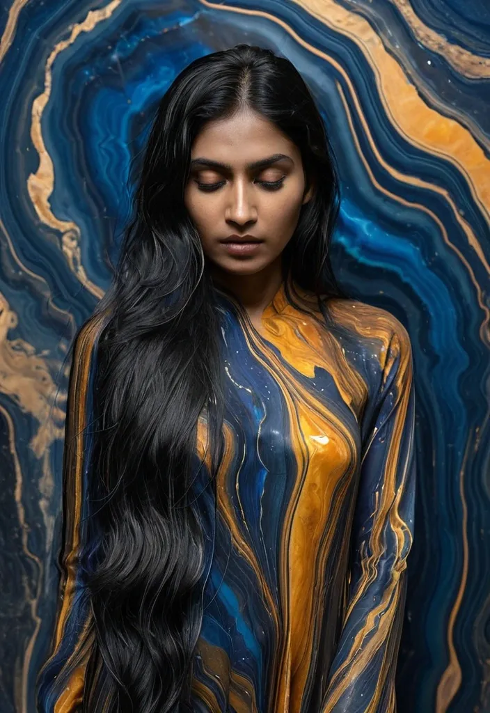 Hyperrealistic portrait of a breathtakingly beautiful South Indian woman in her 48s , long black hair , deep expressive dark eyes , serene and divine expression , ultra-detailed mature facial features , adorned with diamond-studded traditional Indian golden jewelry - diamond maang tikka melting slightly into stardust , crescent moon-shaped jhumkas bending with gravity-defying elegance , surreal Salvador Dalí-style , black background hyperrealistic , sharp clarity on diamonds , cinematic backlight , mythological elegance , fantasy surrealism ,
