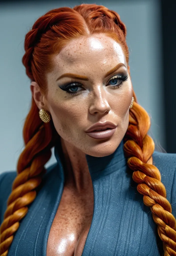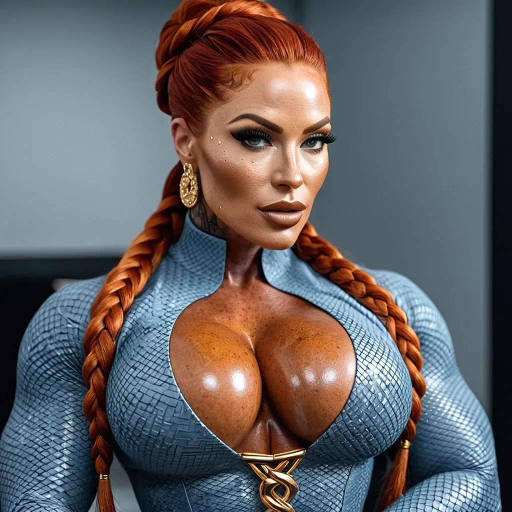 Generate Gorgeous female boss , bimbo , hourglass body , abnormally massive female bodybuilder , gorgeous , close up , full lips , big booty , redheaded , freckles on face and breast , braided design hair , feminine silhouette , too big breast , big booty , sexy thighs abs , silhouette , up close , flexing biceps , beautiful green eyes , legs are iconic and defining physical feature , both visually and in terms of combat ability.wearing an outfit that is a striking blend of elegance , power , and femininity , designed to command attention in any room. The suit is tailored to perfection , hugging the wearer’s curves with precision while emphasizing a structured silhouette. The fabric itself is a refined grey tweed patterned with subtle white grid lines , giving the suit a texture that feels both sophisticated and modern. The blazer features broad blue lapels and gold button accents , adding a luxurious touch that elevates the look beyond typical business attire. The matching high-waisted trousers elongate the frame , further enhancing the poised and commanding effect of the ensemble.The styling choices amplify the boldness of the suit. The inner blouse is a silky , greybutton-down shirt that complements the tweed’s tone while introducing a softer , feminine balance to the sharp tailoring of the jacket. The blouse peeks out neatly from under the blazer , maintaining elegance without drawing focus away from the suit’s commanding cut. Accessories are kept minimal yet intentional: a delicate layered gold necklace and hoop earrings that add glimmers of light and luxury without overpowering the outfit. The choice of voluminous , honey-brown braids cascading down her shoulders frames the face with both confidence and glamour , completing the commanding visual.Altogether , this look communicates a blend of authority and allure. It is business-ready yet fashion-forward , balancing corporate structure with vibrant femininity. The color palette blue , grey and gold avoids being overly delicate , instead embracing the richness of texture , structure , and presence. This is the kind of ensemble that speaks to ambition , sophistication , and personal style—ideal for someone who thrives in positions of influence but insists on expressing her individuality with bold elegance. It’s not just clothing—it’s a statement of power wrapped in grace. ,