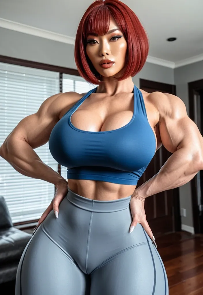 Generate Gorgeous female boss , bimbo , hourglass body , Japanese woman , abnormally massive female bodybuilder , gorgeous , close up , full lips , big booty , red hair , short bob-cut hair , , feminine silhouette , too big breast , big booty , sexy thighs abs , silhouette , up close , flexing biceps , beautiful brown eyes , legs are iconic and defining physical feature , both visually and in terms of combat ability.wearing an outfit that is a striking blend of elegance , power , and femininity , designed to command attention in any room. Outfit tailored to perfection , hugging the wearer’s curves with precision while emphasizing a structured silhouette. The fabric texture that feels both sophisticated and modern. The tank top features a luxurious touch that elevates the look beyond typical attire. The matching high-waisted shorts elongate the frame , further enhancing the poised and commanding effect of the ensemble.The styling choices amplify the boldness of the outfit. The outfit complements the tweed’s tone while introducing a softer , feminine balance to the sharp tailoring of the outfit. She is maintaining elegance without drawing focus away from the outfit commanding cut. Accessories are kept minimal yet intentional: a delicate layered gold necklace and hoop earrings that add glimmers of light and luxury without overpowering the outfit. The choice of voluminous , short bob-cut hair cascading down to her shoulders frames the face with both confidence and glamour , completing the commanding visual.Altogether , this look communicates a blend of authority and allure. It is fashion-forward , balancing corporate structure with vibrant femininity. The color palette blue tank top and grey short avoids being overly delicate , instead embracing the richness of texture , structure , and presence. This is the kind of ensemble that speaks to ambition , sophistication , and personal style—ideal for someone who thrives in positions of influence but insists on expressing her individuality with bold elegance. It’s not just clothing—it’s a statement of power wrapped in grace. In luxury living legs that could crush a cement block , she has a bold and striking statement piece , her big lips heart shaped lips in glossy red that gives them a sleek , polished finish. Adding both edge and detail to their design. The towering stiletto heel , paired with a thick platform sole , creates an ultra-dramatic silhouette that elongates the leg and exudes power and confidence. With their combination of shine , height , and structure , these boots perfectly balance fierce femininity with high-fashion allure. High cheekbones , prominent jawline , gorgeous big brown eyes , enormous breast , blue tank top , inside suburban home in grey pants , enormous butt ,