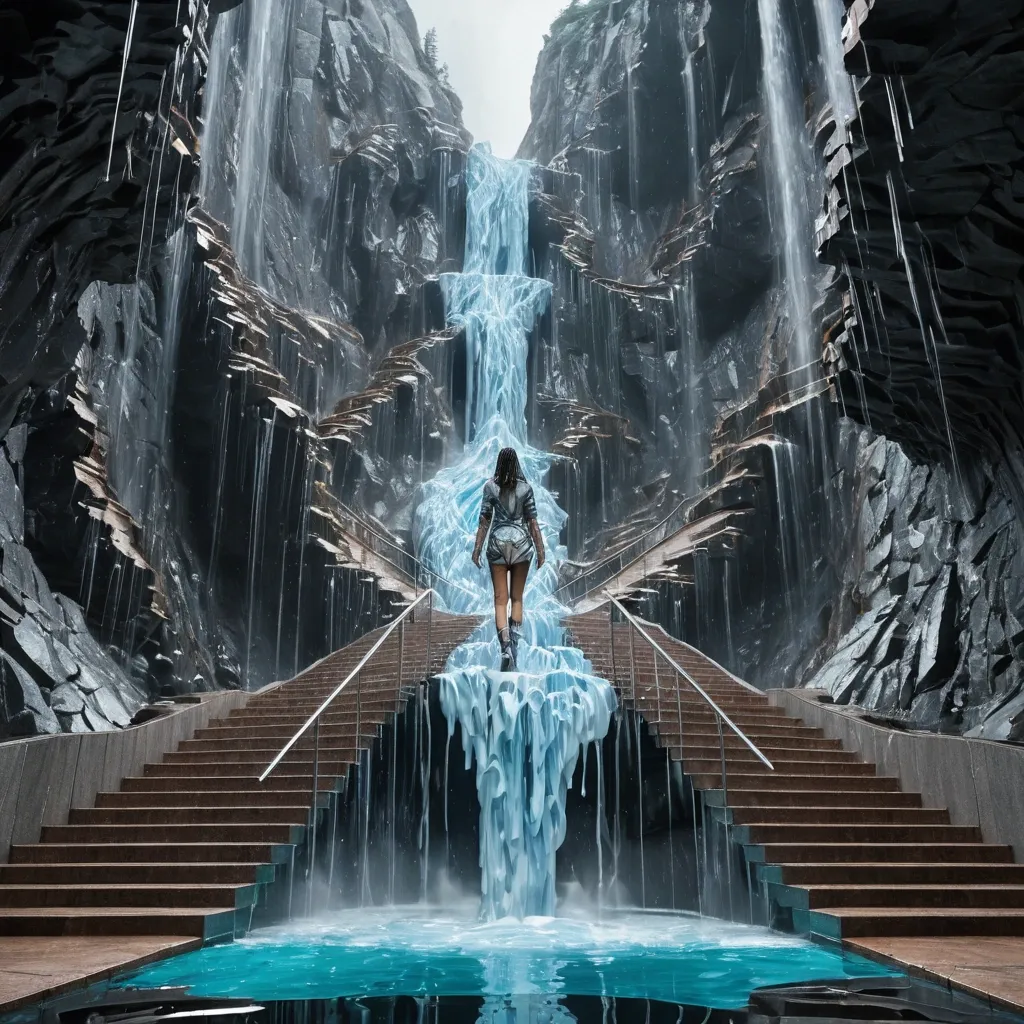 A surreal Melting from Rocky Mountains split by a partially staircase. On the outside of the vortex staircase , gravity-defying waterfall cascades upwards into the mountain , defying the laws of physics. The water flows through a series of floating islands and structure of the Head in an abstract Holographic Interference style , female warrior on staircase , the interior revealed by the unzipping above showcases a rain and water drops textures drip downward from the sky like river. ,