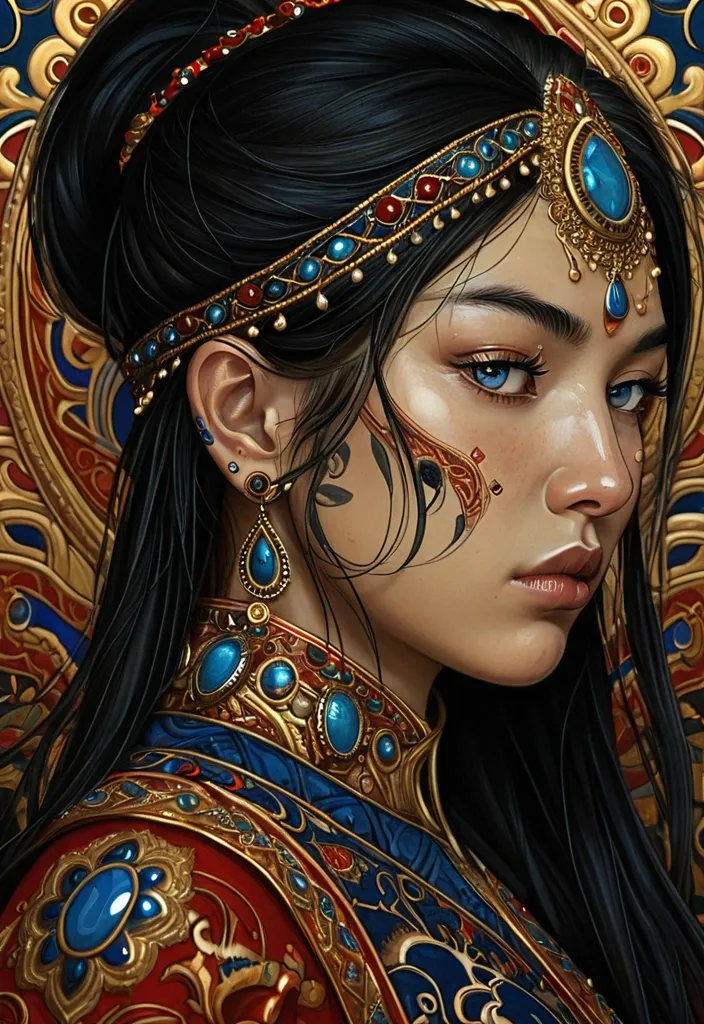A detailed digital illustration of a Kazakh woman's profile , featuring intricate attire adorned in high ornate gold and red , with a poignant tattoo that displays her deep blue eyes and brown belly while her black hair frames her face. The illustration's focus is on her intimate connection with the viewer , leaving the viewer with the depth and mystery of the artwork beyond the unidentifiable. ,