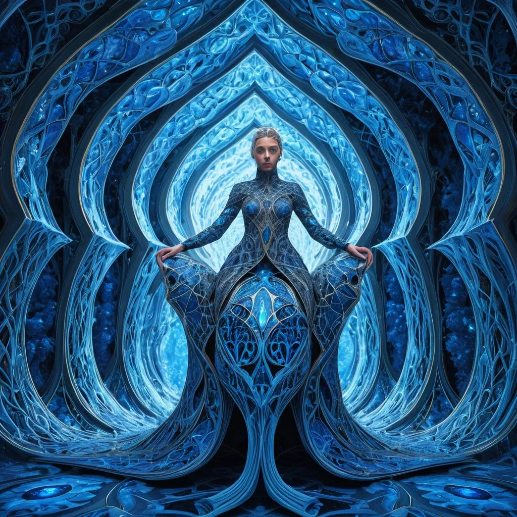 A futuristic vision of a fusion of Escher and Dali styles made of Tendrils , Ice cathedral , surreal twisting forms , intricate geometrical patterns , universal glowing landscapes , (contemporaneity blue gradient colors) , covered with flora carpets the crystal walls , a crystalline Arabian woman with striking blue eyes riding on fiant Black panther with glowing red eyes , intricate fractal filigree patterns covering skin and fur in gold and sapphire blue , ultra-detailed ornate baroque style , high depth cinematic detail , (ultra-detailed) , imaginative composition , enchanting atmosphere , full illusion , Chaotic Harmony elements. ,