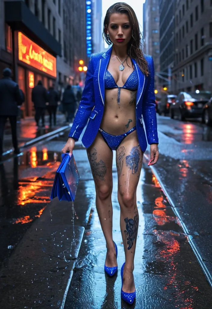 On a glistening New York City street after rain , a bold female detective wears a royal blue Swarovski-encrusted bikini with matching blazer. Intricate body tattoos peek through as she stands confidently in crimson Louboutin heels , holding an evidence file while neon reflections dance across wet concrete. ,