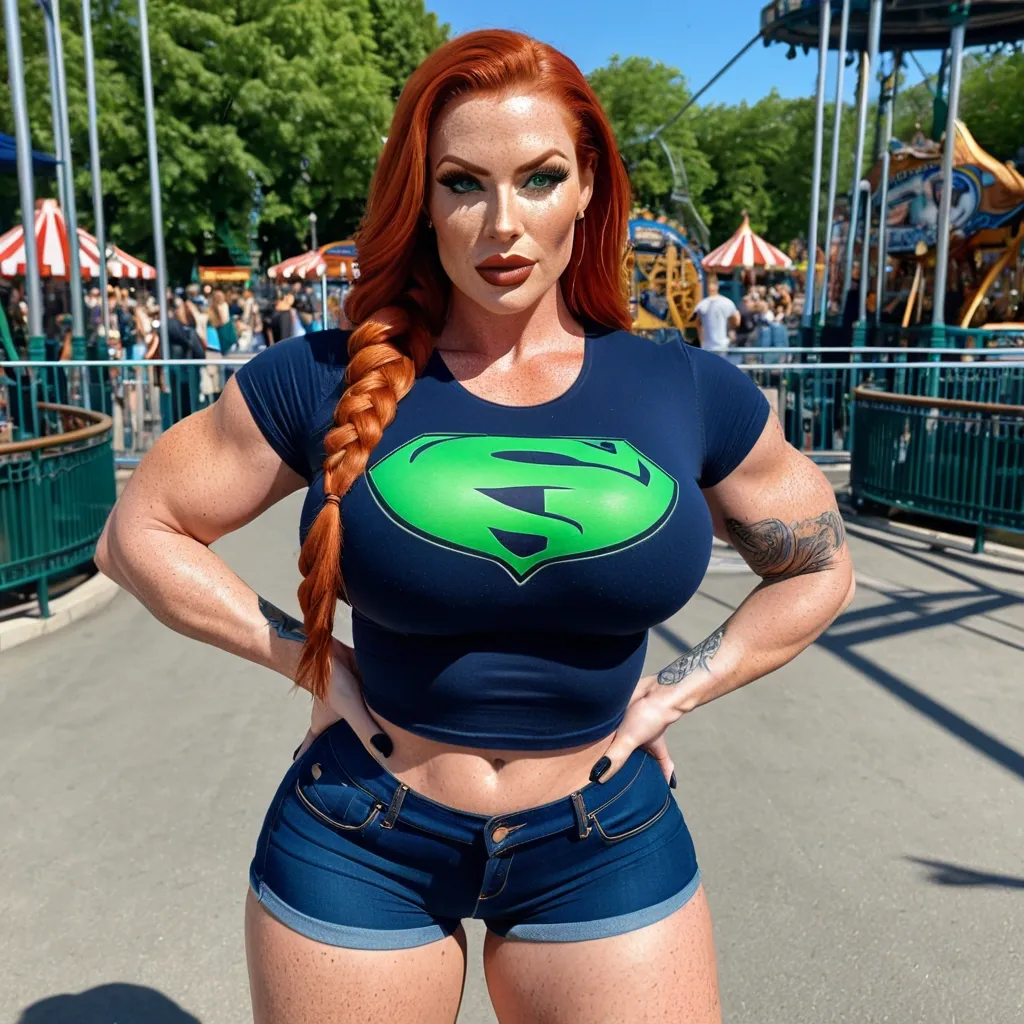 Generate Gorgeous female boss , bimbo , hourglass body , abnormally massive female bodybuilder , gorgeous , close up , full lips , big booty , redheaded , freckles on face and breast , braided design hair , feminine silhouette , too big breast , big booty , sexy thighs abs , silhouette , up close , flexing biceps , beautiful green eyes , legs are iconic and defining physical feature , both visually and in terms of combat ability.wearing an outfit that is a striking blend of elegance , power , and femininity , designed to command attention in any room. The suit is tailored to perfection , hugging the wearer’s curves with precision while emphasizing a structured silhouette. The fabric itself is a refined grey tweed patterned with subtle white grid lines , giving the suit a texture that feels both sophisticated and modern. The blazer features broad blue lapels and gold button accents , adding a luxurious touch that elevates the look beyond typical business attire. The matching high-waisted trousers elongate the frame , further enhancing the poised and commanding effect of the ensemble.The styling choices amplify the boldness of the suit. The inner blouse is a silky , greybutton-down shirt that complements the tweed’s tone while introducing a softer , feminine balance to the sharp tailoring of the jacket. The blouse peeks out neatly from under the blazer , maintaining elegance without drawing focus away from the suit’s commanding cut. Accessories are kept minimal yet intentional: a delicate layered gold necklace and hoop earrings that add glimmers of light and luxury without overpowering the outfit. The choice of voluminous , honey-brown braids cascading down her shoulders frames the face with both confidence and glamour , completing the commanding visual.Altogether , this look communicates a blend of authority and allure. It is business-ready yet fashion-forward , balancing corporate structure with vibrant femininity. The color palette blue , grey and gold avoids being overly delicate , instead embracing the richness of texture , structure , and presence. This is the kind of ensemble that speaks to ambition , sophistication , and personal style—ideal for someone who thrives in positions of influence but insists on expressing her individuality with bold elegance. It’s not just clothing—it’s a statement of power wrapped in grace. In luxury living legs that could crush a watermelon , skirt high boots are a bold and striking statement piece , crafted in glossy black patent leather that gives them a sleek , polished finish. Rising to just below the knee , the boots feature three adjustable buckle straps along the shaft , adding both edge and detail to their design. The towering stiletto heel , paired with a thick platform sole , creates an ultra-dramatic silhouette that elongates the leg and exudes power and confidence. With their combination of shine , height , and structure , these boots perfectly balance fierce femininity with high-fashion allure. Massive breast , massive cleavage , Up close shot ,