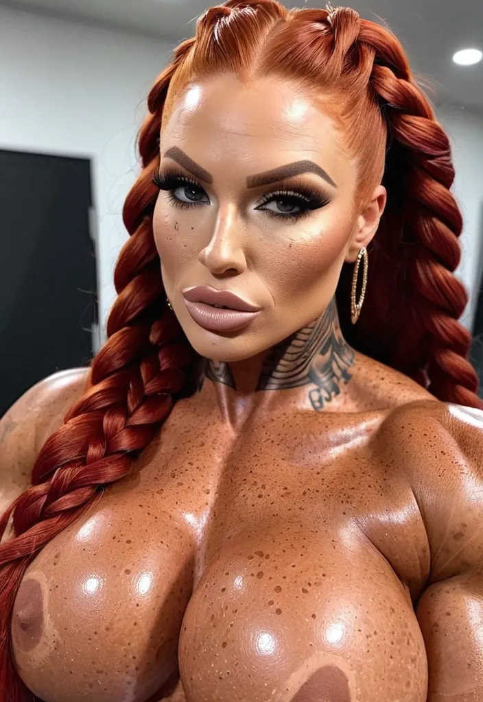 Generate Gorgeous female boss , bimbo , hourglass body , abnormally massive female bodybuilder , gorgeous , close up , full lips , big booty , redheaded , freckles on face and breast , braided design hair , feminine silhouette , too big breast , big booty , sexy thighs abs , silhouette , up close , flexing biceps , beautiful green eyes , legs are iconic and defining physical feature , both visually and in terms of combat ability.wearing an outfit that is a striking blend of elegance , power , and femininity , designed to command attention in any room. The suit is tailored to perfection , hugging the wearer’s curves with precision while emphasizing a structured silhouette. The fabric itself is a refined grey tweed patterned with subtle white grid lines , giving the suit a texture that feels both sophisticated and modern. The blazer features broad blue lapels and gold button accents , adding a luxurious touch that elevates the look beyond typical business attire. The matching high-waisted trousers elongate the frame , further enhancing the poised and commanding effect of the ensemble.The styling choices amplify the boldness of the suit. The inner blouse is a silky , greybutton-down shirt that complements the tweed’s tone while introducing a softer , feminine balance to the sharp tailoring of the jacket. The blouse peeks out neatly from under the blazer , maintaining elegance without drawing focus away from the suit’s commanding cut. Accessories are kept minimal yet intentional: a delicate layered gold necklace and hoop earrings that add glimmers of light and luxury without overpowering the outfit. The choice of voluminous , honey-brown braids cascading down her shoulders frames the face with both confidence and glamour , completing the commanding visual.Altogether , this look communicates a blend of authority and allure. It is business-ready yet fashion-forward , balancing corporate structure with vibrant femininity. The color palette blue , grey and gold avoids being overly delicate , instead embracing the richness of texture , structure , and presence. This is the kind of ensemble that speaks to ambition , sophistication , and personal style—ideal for someone who thrives in positions of influence but insists on expressing her individuality with bold elegance. It’s not just clothing—it’s a statement of power wrapped in grace. In luxury living legs that could crush a watermelon , skirt high boots are a bold and striking statement piece , crafted in glossy black patent leather that gives them a sleek , polished finish. Rising to just below the knee , the boots feature three adjustable buckle straps along the shaft , adding both edge and detail to their design. The towering stiletto heel , paired with a thick platform sole , creates an ultra-dramatic silhouette that elongates the leg and exudes power and confidence. With their combination of shine , height , and structure , these boots perfectly balance fierce femininity with high-fashion allure. ,