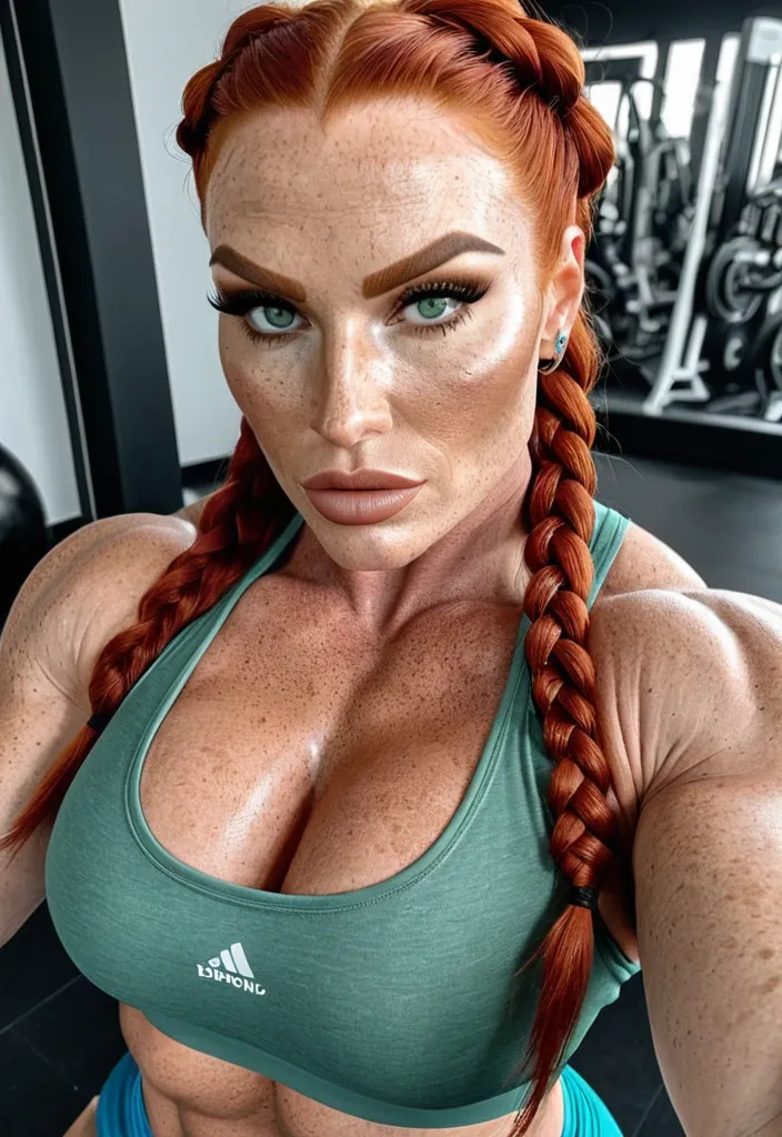 Generate Gorgeous female boss , bimbo , hourglass body , abnormally massive female bodybuilder , gorgeous , close up , full lips , big booty , redhead , freckles on face and breast , braided design hair , feminine silhouette , too big breast , big booty , sexy thighs abs , silhouette , up close , flexing biceps , beautiful green eyes , legs are iconic and defining physical feature , both visually and in terms of combat ability.wearing an outfit that is a striking blend of elegance , power , and femininity , designed to command attention in any room. The suit is tailored to perfection , hugging the wearer’s curves with precision while emphasizing a structured silhouette. The fabric itself is a refined grey tweed patterned with subtle white grid lines , giving the suit a texture that feels both sophisticated and modern. The blazer features broad blue lapels and gold button accents , adding a luxurious touch that elevates the look beyond typical business attire. The matching high-waisted trousers elongate the frame , further enhancing the poised and commanding effect of the ensemble.The styling choices amplify the boldness of the suit. The inner blouse is a silky , greybutton-down shirt that complements the tweed’s tone while introducing a softer , feminine balance to the sharp tailoring of the jacket. The blouse peeks out neatly from under the blazer , maintaining elegance without drawing focus away from the suit’s commanding cut. Accessories are kept minimal yet intentional: a delicate layered gold necklace and hoop earrings that add glimmers of light and luxury without overpowering the outfit. The choice of voluminous , honey-brown braids cascading down her shoulders frames the face with both confidence and glamour , completing the commanding visual.Altogether , this look communicates a blend of authority and allure. It is business-ready yet fashion-forward , balancing corporate structure with vibrant femininity. The color palette blue , grey and gold avoids being overly delicate , instead embracing the richness of texture , structure , and presence. This is the kind of ensemble that speaks to ambition , sophistication , and personal style—ideal for someone who thrives in positions of influence but insists on expressing her individuality with bold elegance. It’s not just clothing—it’s a statement of power wrapped in grace. In luxury living legs that could crush a watermelon , skirt high boots are a bold and striking statement piece , crafted in glossy black patent leather that gives them a sleek , polished finish. Rising to just below the knee , the boots feature three adjustable buckle straps along the shaft , adding both edge and detail to their design. The towering stiletto heel , paired with a thick platform sole , creates an ultra-dramatic silhouette that elongates the leg and exudes power and confidence. With their combination of shine , height , and structure , these boots perfectly balance fierce femininity with high-fashion allure. High cheekbones , prominent jawline , gorgeous big green eyes , freckles , enormous breast , blue tank top , high rise grey shorts ,