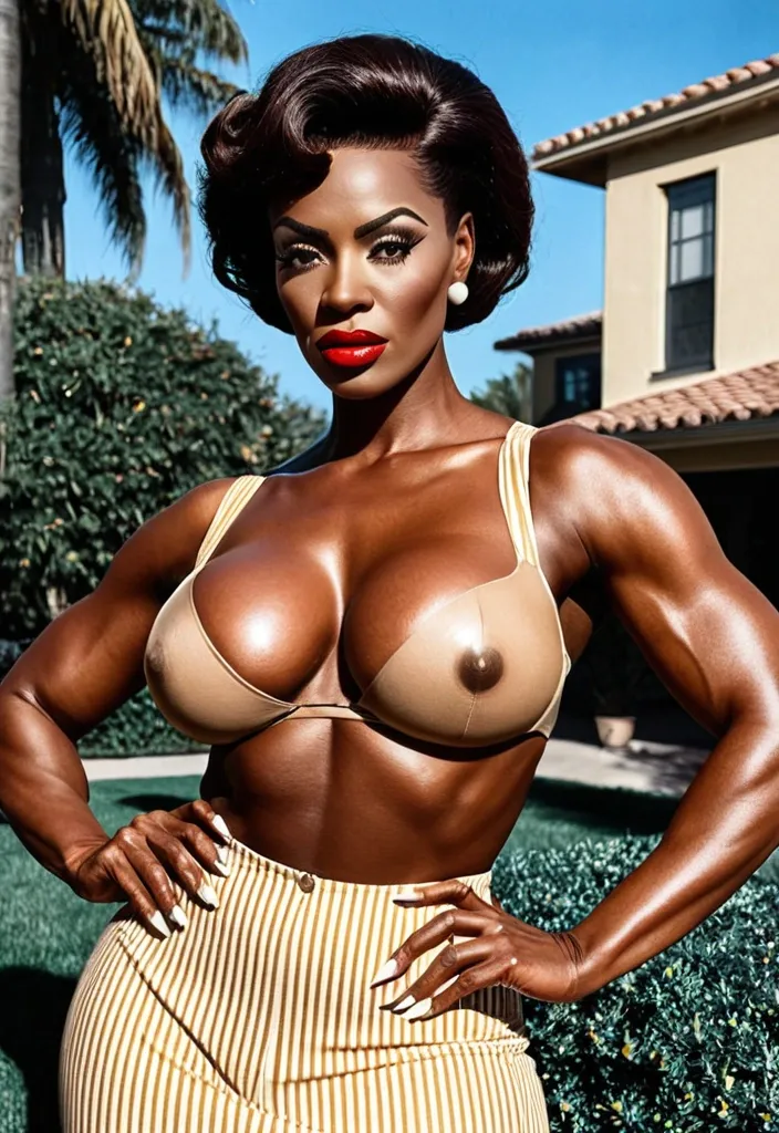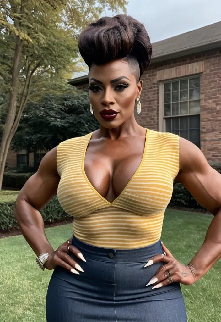 1940s Generate Gorgeous 37 years old , female boss , dark-skinned African-American woman , bimbo , hourglass body , abnormally massive female bodybuilder , gorgeous , close up , full lips , big booty , brown hair , 1940s short pixie hair , shaved on the side , bangs , feminine silhouette , too big breast , big booty , sexy thighs abs , silhouette , up close , flexing biceps , beautiful brown eyes , legs are iconic and defining physical feature , both visually and in terms of combat ability.wearing an outfit that is a striking blend of elegance , power , and femininity , designed to command attention in any room. The suit is tailored to perfection , hugging the wearer’s curves with precision while emphasizing a structured silhouette. The fabric itself is a refined grey tweed patterned with subtle white grid lines , giving the suit a texture that feels both sophisticated and modern. The blazer features broad blue lapels and gold button accents , adding a luxurious touch that elevates the look beyond typical business attire. The matching high-waisted trousers elongate the frame , further enhancing the poised and commanding effect of the ensemble.The styling choices amplify the boldness of the suit. The inner blouse is a silky , greybutton-down shirt that complements the tweed’s tone while introducing a softer , feminine balance to the sharp tailoring of the jacket. The blouse peeks out neatly from under the blazer , maintaining elegance without drawing focus away from the suit’s commanding cut. Accessories are kept minimal yet intentional: a delicate layered gold necklace and hoop earrings that add glimmers of light and luxury without overpowering the outfit. The choice of voluminous , honey-brown braids cascading down her shoulders frames the face with both confidence and glamour , completing the commanding visual.Altogether , this look communicates a blend of authority and allure. It is business-ready yet fashion-forward , balancing corporate structure with vibrant femininity. The color palette blue , grey and gold avoids being overly delicate , instead embracing the richness of texture , structure , and presence. This is the kind of ensemble that speaks to ambition , sophistication , and personal style—ideal for someone who thrives in positions of influence but insists on expressing her individuality with bold elegance. It’s not just clothing—it’s a statement of power wrapped in grace. In luxury living legs that could crush a watermelon , skirt high boots are a bold and striking statement piece , crafted in glossy black patent leather that gives them a sleek , polished finish. Rising to just below the knee , the boots feature three adjustable buckle straps along the shaft , adding both edge and detail to their design. The towering stiletto heel , paired with a thick platform sole , creates an ultra-dramatic silhouette that elongates the leg and exudes power and confidence. With their combination of shine , height , and structure , these boots perfectly balance fierce femininity with high-fashion allure. High cheekbones , prominent jawline , gorgeous big brown eyes , 1940s , enormous breast , grey denim pants , yellow and blue horizontal striped v neck t- shirt , skirt , front yard gorgeous brown eyes , denim pants ,