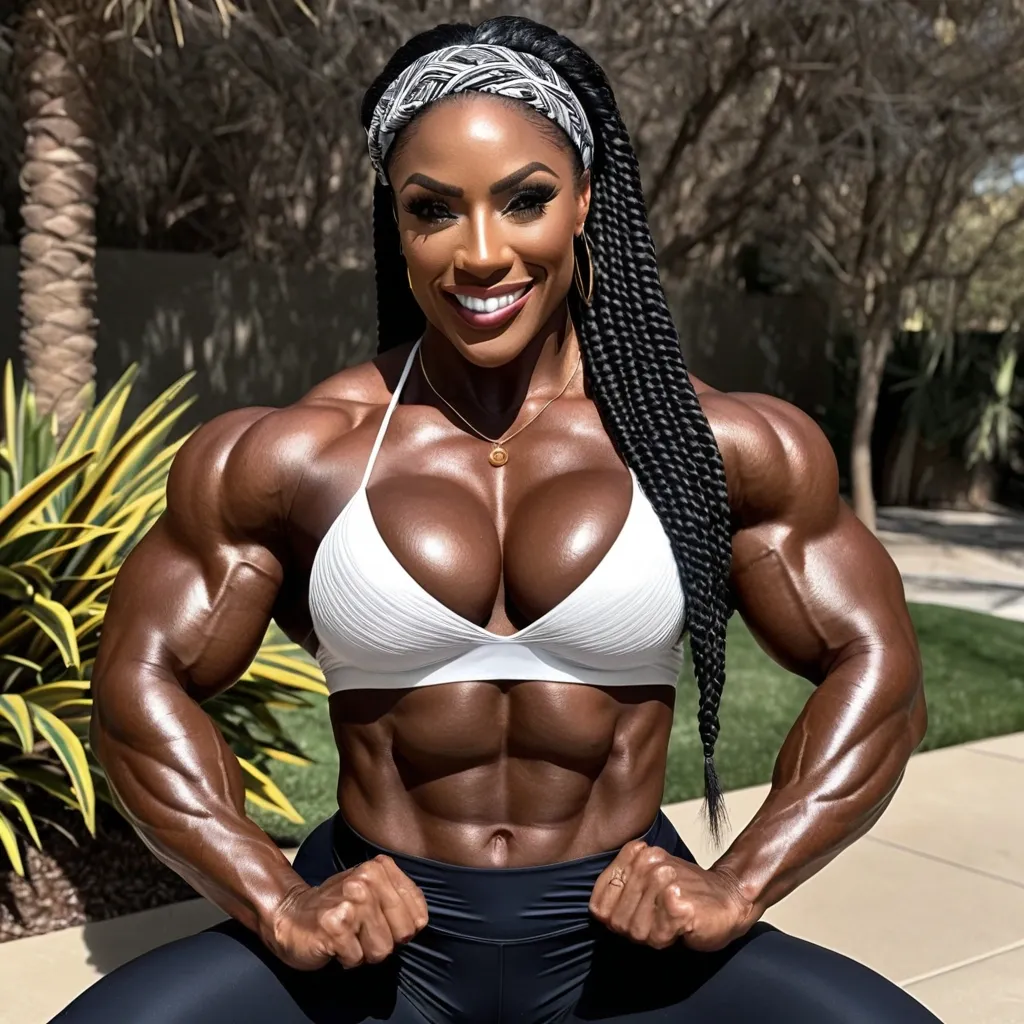 This woman is a striking African-American female bodybuilder whose deep , rich ebony skin tone glows with a warm , glossy sheen under the light , highlighting every curve and contour of her hyper-muscular physique. Her complexion is a flawless dark chocolate brown , smooth and radiant , with subtle highlights that accentuate the vascularity and separation in her massive deltoids , biceps , and pectorals. Her hair is styled in long , thick black braids that cascade down her back , partially gathered and secured by a patterned black-and-white paisley headband that sits snugly across her forehead , adding a touch of feminine flair to her otherwise powerfully masculine presentation.Her face is beautifully feminine despite the extreme muscularity , with high cheekbones , full lips curved into a bright , confident smile that reveals perfect white teeth , and large , expressive eyes framed by long lashes and subtly arched brows. Her eyes are a deep brown , sparkling with joy and self-assurance as she gazes slightly downward , giving her an approachable yet commanding presence. Delicate gold hoop earrings and a thin gold necklace with a small pendant draw attention to her elegant neck and collarbone , contrasting softly with the hardness of her traps and delts.She wears a tight white sports bra that struggles to contain her enormous , rounded pectoral muscles , which are so thick and developed that they push forward dramatically , creating a shelf-like appearance beneath the fabric. The bra’s material clings to every ridge and vein , with a small circular detail at the center drawing the eye to the deep separation between her pecs. Below , her midsection reveals a chiseled eight-pack of abs , each block sharply defined and separated by deep etchings. Her arms are colossal—biceps that peak like mountains , forearms thick with cable-like veins—and rest casually on her thighs , which are wrapped in dark navy leggings that stretch over quads so massive they force her knees apart even while seated. Every inch of her body screams power , yet her smile and soft accessories keep her radiating warmth and femininity. Enormous breast , enormous butt , in backyard ,
