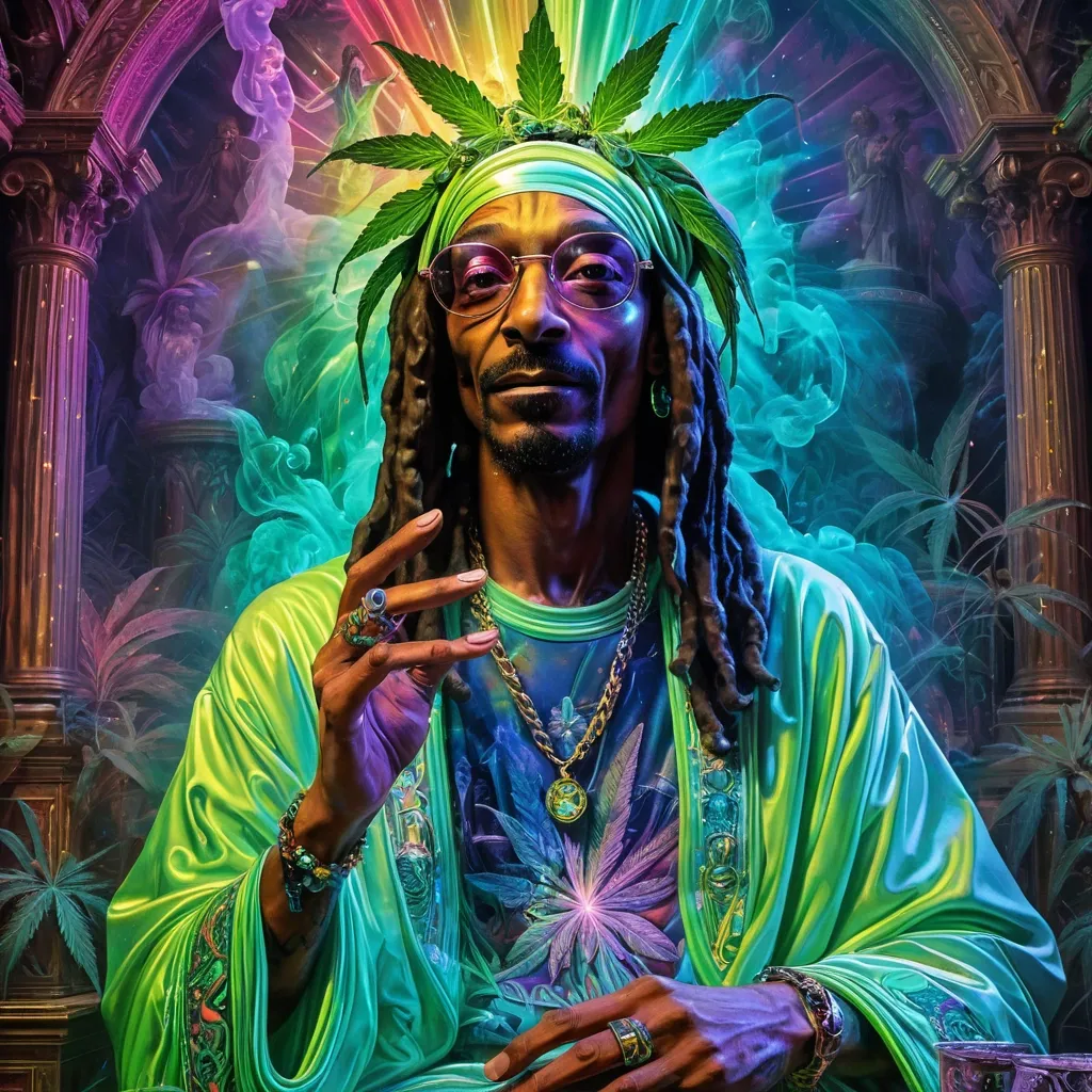 neoclassicist colorful blacklight uv highly detailed painting of Snoop Dogg as a marijuana goddess , ethereal fantasy hyperdetailed mist , maximalist matte painting , polished , realistic oil painting; old fashioned , vintage , antique; luminous color sparkles , marijuana , by gaston bussiere , craig mullins , j. c. leyendecker , norman rockwell ,