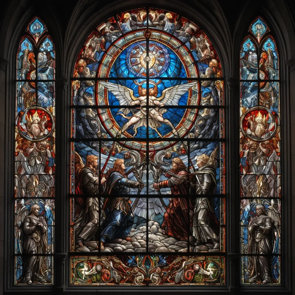 The image showcases a traditional stained glass window depicting an epic battle between an angel and a demon. The angel is portrayed with majestic , feathered wings and a halo , symbolizing purity and divinity. In contrast , the demon is characterized by dark , bat-like wings and a menacing stance , representing darkness and malevolence. They are engaged in a dramatic sword fight , at the center of which is a bright burst of light , possibly indicating the clashing of their weapons.The stained glass window is intricately detailed , with a rich palette of colors. The upper portion of the window displays symmetrical designs with a variety of vibrant colors that resemble flames , suggesting the intensity of the heavenly battle. Below the figures , the chaos of battle continues with a depiction of numerous human figures engaged in their own struggle , adding to the scene's dynamic nature.The overall composition is symmetrical and balanced , with the angel and demon positioned as mirror images of each other , reinforcing the theme of the eternal struggle between good and evil. The background of the window is a complex array of cloud-like formations , providing a sense of depth and movement to the celestial scene above.The lower part of the window serves as a narrative foundation , grounding the heavenly conflict in the mortal realm , perhaps implying that the outcomes of such cosmic battles have direct consequences on the human condition. The craftsmanship of the stained glass , with its leaded divisions and varying textures and hues , contributes to a sense of grandeur and historical significance. ,