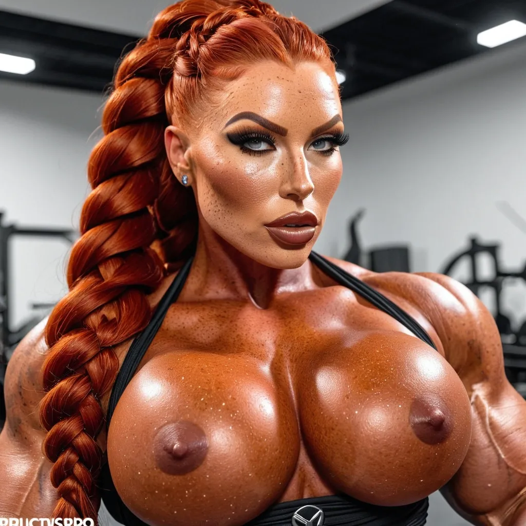 Generate Gorgeous female boss , bimbo , hourglass body , abnormally massive female bodybuilder , gorgeous , close up , full lips , big booty , redheaded , freckles on face and breast , braided design hair , feminine silhouette , too big breast , big booty , sexy thighs abs , silhouette , up close , flexing biceps , beautiful green eyes , legs are iconic and defining physical feature , both visually and in terms of combat ability.wearing an outfit that is a striking blend of elegance , power , and femininity , designed to command attention in any room. The suit is tailored to perfection , hugging the wearer’s curves with precision while emphasizing a structured silhouette. The fabric itself is a refined grey tweed patterned with subtle white grid lines , giving the suit a texture that feels both sophisticated and modern. The blazer features broad blue lapels and gold button accents , adding a luxurious touch that elevates the look beyond typical business attire. The matching high-waisted trousers elongate the frame , further enhancing the poised and commanding effect of the ensemble.The styling choices amplify the boldness of the suit. The inner blouse is a silky , greybutton-down shirt that complements the tweed’s tone while introducing a softer , feminine balance to the sharp tailoring of the jacket. The blouse peeks out neatly from under the blazer , maintaining elegance without drawing focus away from the suit’s commanding cut. Accessories are kept minimal yet intentional: a delicate layered gold necklace and hoop earrings that add glimmers of light and luxury without overpowering the outfit. The choice of voluminous , honey-brown braids cascading down her shoulders frames the face with both confidence and glamour , completing the commanding visual.Altogether , this look communicates a blend of authority and allure. It is business-ready yet fashion-forward , balancing corporate structure with vibrant femininity. The color palette blue , grey and gold avoids being overly delicate , instead embracing the richness of texture , structure , and presence. This is the kind of ensemble that speaks to ambition , sophistication , and personal style—ideal for someone who thrives in positions of influence but insists on expressing her individuality with bold elegance. It’s not just clothing—it’s a statement of power wrapped in grace. In luxury living legs that could crush a watermelon , skirt high boots are a bold and striking statement piece , crafted in glossy black patent leather that gives them a sleek , polished finish. Rising to just below the knee , the boots feature three adjustable buckle straps along the shaft , adding both edge and detail to their design. The towering stiletto heel , paired with a thick platform sole , creates an ultra-dramatic silhouette that elongates the leg and exudes power and confidence. With their combination of shine , height , and structure , these boots perfectly balance fierce femininity with high-fashion allure. ,