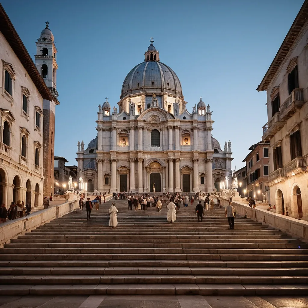 16th Century Italian Church of the Redeemer , grand Renaissance church with white marble façade , elegant domes and bell towers , wide stone steps leading to the entrance , surrounding Venetian canals with gondolas drifting , people in 16th century Italian attire , evening lanterns reflecting on the water , atmosphere of devotion and grandeur , dusk , clear skies , summer , Unreal Engine , 4K ,