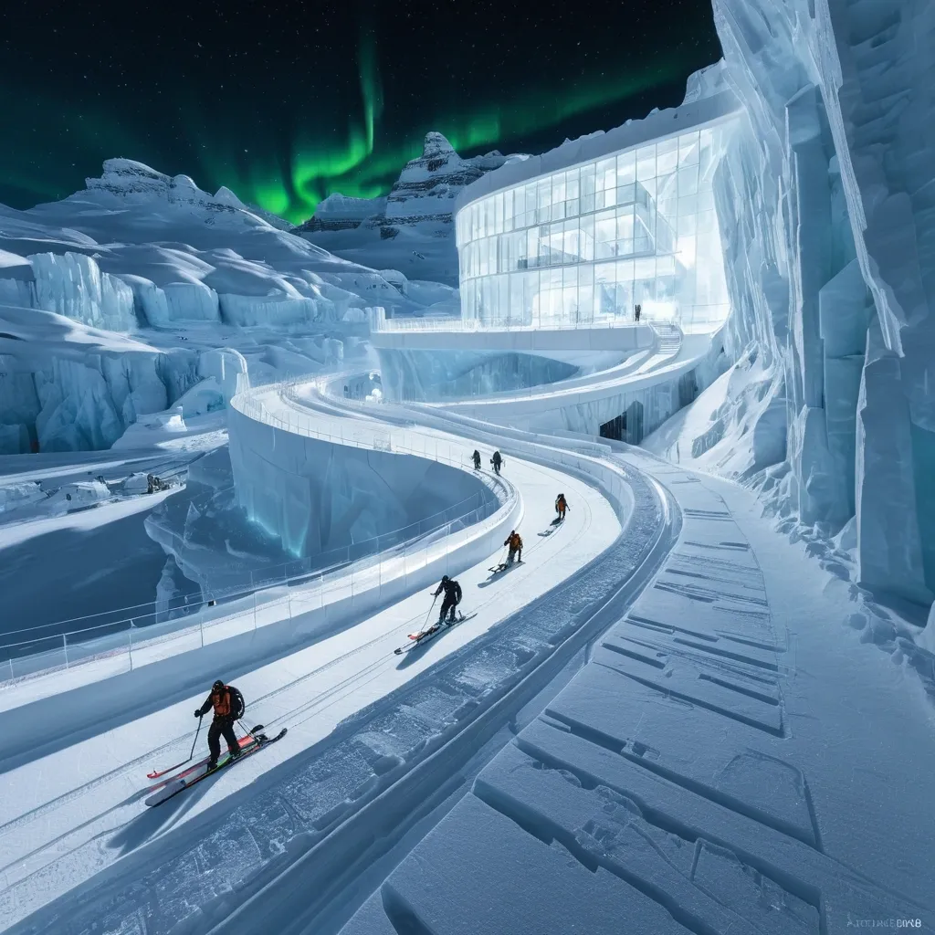 A polar landscape of snowfields and crystal cliffs lies under aurora , dominated by a colossal white staircase floating above the ice. It rises toward a luminous doorway hanging in open space , but its shadow reveals a circular palace seen from above. Small sled caravans approach , leaving tracks that curve around invisible architecture beneath the snow. Distant icebergs stand like monoliths , their reflections showing warm interior stair halls and balconies. Compose it as a wide cinematic shot with the staircase off-center beneath an immense sky. Lighting is pristine: cold moonlight , subtle aurora spill , sharp edges on crystal and frost , incredible clarity in snow texture , breath vapor , and hidden reflected geometry. --chaos 30 --ar 16:9 --profile skx15nm --stylize 700 --v 8 ,