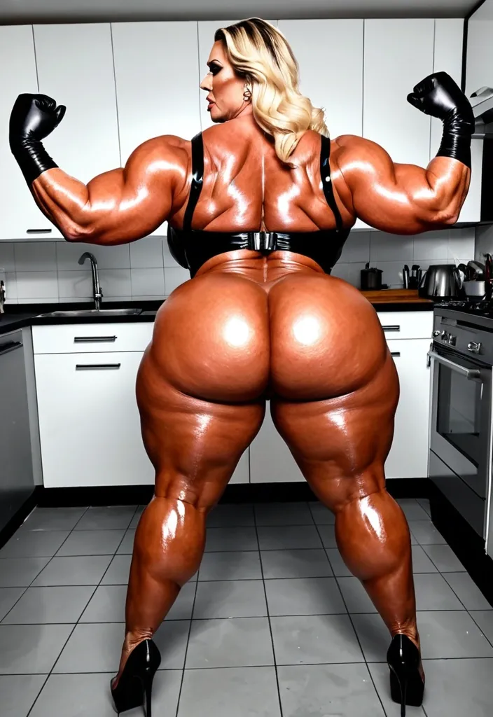 Plan de profil de Very giant curvy bbw bimbo muscular most amazing busty tallest lady with too big implants breast , enormous ass , bbw muscular enormous bimbo powerlifteuse , abnormally massive female muscular bodybuilder , bbw , Géante dame en talons , very big ass , curvacious , gorgeous , Kate Winslet face , flexing in front of tiny burglar in a narrow kitchen at evening , wearing a black widow dress , gros seins en évidence , gros biceps énormes , biggest ass , cuisses en évidence , portant des talons , make up , mini latex gloves , vue de profil ,