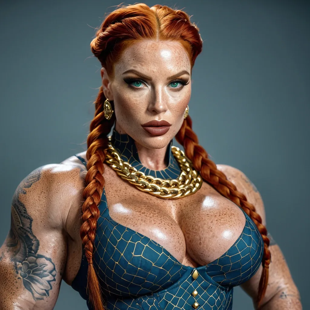Generate Gorgeous female boss , bimbo , hourglass body , abnormally massive female bodybuilder , gorgeous , close up , full lips , big booty , redheaded , freckles on face and breast , braided design hair , feminine silhouette , too big breast , big booty , sexy thighs abs , silhouette , up close , flexing biceps , beautiful green eyes , legs are iconic and defining physical feature , both visually and in terms of combat ability.wearing an outfit that is a striking blend of elegance , power , and femininity , designed to command attention in any room. The suit is tailored to perfection , hugging the wearer’s curves with precision while emphasizing a structured silhouette. The fabric itself is a refined grey tweed patterned with subtle white grid lines , giving the suit a texture that feels both sophisticated and modern. The blazer features broad blue lapels and gold button accents , adding a luxurious touch that elevates the look beyond typical business attire. The matching high-waisted trousers elongate the frame , further enhancing the poised and commanding effect of the ensemble.The styling choices amplify the boldness of the suit. The inner blouse is a silky , greybutton-down shirt that complements the tweed’s tone while introducing a softer , feminine balance to the sharp tailoring of the jacket. The blouse peeks out neatly from under the blazer , maintaining elegance without drawing focus away from the suit’s commanding cut. Accessories are kept minimal yet intentional: a delicate layered gold necklace and hoop earrings that add glimmers of light and luxury without overpowering the outfit. The choice of voluminous , honey-brown braids cascading down her shoulders frames the face with both confidence and glamour , completing the commanding visual.Altogether , this look communicates a blend of authority and allure. It is business-ready yet fashion-forward , balancing corporate structure with vibrant femininity. The color palette blue , grey and gold avoids being overly delicate , instead embracing the richness of texture , structure , and presence. This is the kind of ensemble that speaks to ambition , sophistication , and personal style—ideal for someone who thrives in positions of influence but insists on expressing her individuality with bold elegance. It’s not just clothing—it’s a statement of power wrapped in grace.freckles , gorgeous , green eyes , very big lips ,