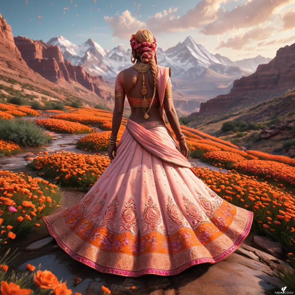 A mdjrny-v4 style portrait photograph of Back view , beautiful masterpiece cinematic , hyper Indian woman in Saree , wearing light pink and orange flowers , braided blonde hair , (((wild festival celebration))) environment , (3D rendering:1.1) Heavy Sequence Embroidery Chaniya Choli with a smaller flow , Dupatta spiral outward in all directions , creating a dramatic and visually striking effect , a natural , Utah landscape , ultra realistic , concept art , elegant , ((intricate)) , ((highly detailed)) , depth of field , ((professionally color graded)) , 8k , art by artgerm and greg rutkowski. ,