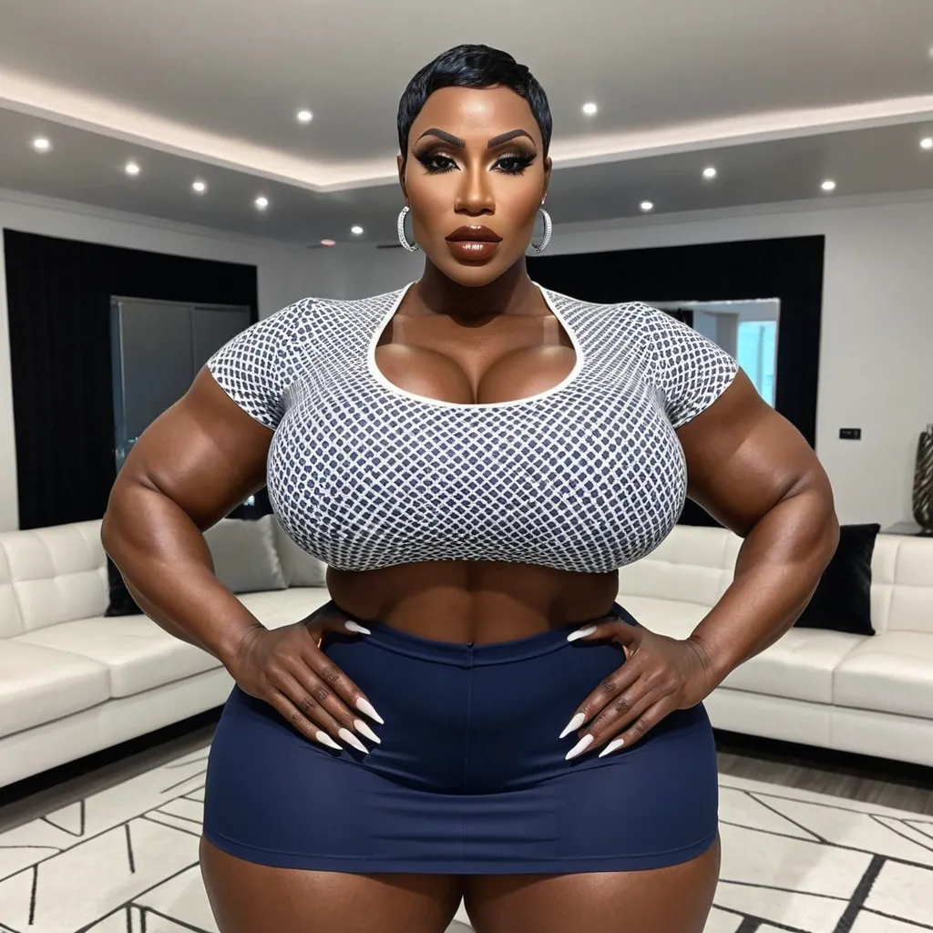 Generate Gorgeous female boss , bimbo , very dark-skinned African-American woman , short , pixie hair , hourglass body , abnormally massive female bodybuilder , gorgeous , close up , full lips , big booty , dark brown eyes , very big plump lips , feminine silhouette , too big breast , big booty , sexy thighs abs , silhouette , up close , flexing biceps , big gorgeous light brown eyes , legs are iconic and defining physical feature , both visually and in terms of combat ability.wearing an outfit that is a striking blend of elegance , power , and femininity , designed to command attention in any room. The suit is tailored to perfection , hugging the wearer’s curves with precision while emphasizing a structured silhouette. The fabric itself is a refined grey tweed patterned with subtle white grid lines , giving the suit a texture that feels both sophisticated and modern. The blazer features broad blue lapels and gold button accents , adding a luxurious touch that elevates the look beyond typical business attire. The matching high-waisted trousers elongate the frame , further enhancing the poised and commanding effect of the ensemble.The styling choices amplify the boldness of the suit. The inner blouse is a silky , greybutton-down shirt that complements the tweed’s tone while introducing a softer , feminine balance to the sharp tailoring of the jacket. The blouse peeks out neatly from under the blazer , maintaining elegance without drawing focus away from the suit’s commanding cut. Accessories are kept minimal yet intentional: a delicate layered gold necklace and hoop earrings that add glimmers of light and luxury without overpowering the outfit. The choice of voluminous , honey-brown braids cascading down her shoulders frames the face with both confidence and glamour , completing the commanding visual.Altogether , this look communicates a blend of authority and allure. It is business-ready yet fashion-forward , balancing corporate structure with vibrant femininity. The color palette blue , grey and gold avoids being overly delicate , instead embracing the richness of texture , structure , and presence. This is the kind of ensemble that speaks to ambition , sophistication , and personal style—ideal for someone who thrives in positions of influence but insists on expressing her individuality with bold elegance. It’s not just clothing—it’s a statement of power wrapped in grace. In luxury living legs that could crush a watermelon , skirt high boots are a bold and striking statement piece , crafted in glossy black patent leather that gives them a sleek , polished finish. Rising to just below the knee , the boots feature three adjustable buckle straps along the shaft , adding both edge and detail to their design. The towering stiletto heel , paired with a thick platform sole , creates an ultra-dramatic silhouette that elongates the leg and exudes power and confidence. With their combination of shine , height , and structure , these boots perfectly balance fierce femininity with high-fashion allure. Massive breast , massive cleavage , driving and standing in living room , short fingernails wearing a white , dark navy blue and black accented subtle symmetrical patterned t-shirt , massive cleavage , grey skirt , enormous butt , arms folded ,