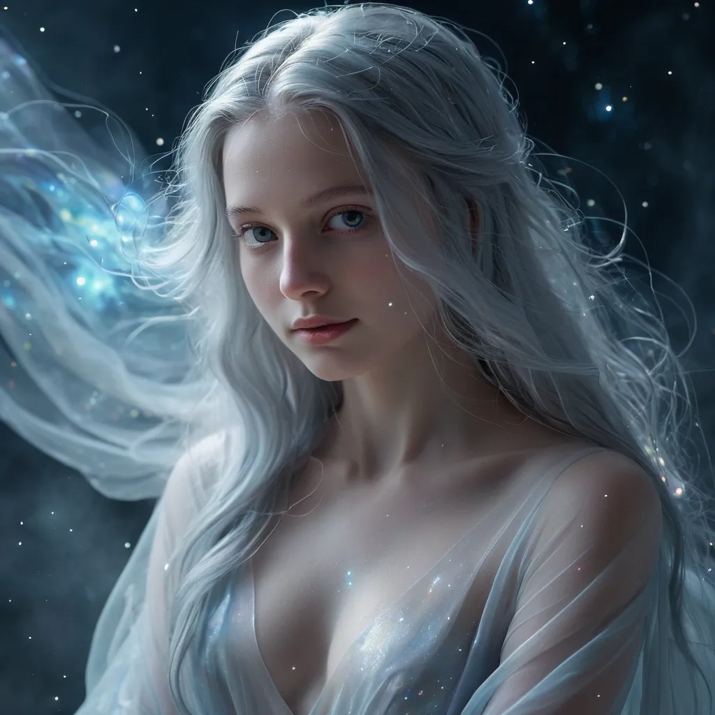 A hyperrealistic , 8K ultra-high-definition , cinematic portrait of an unimaginably beautiful woman , focusing on her upper body. Her beauty is so profound it transcends reality , possessing both pristine purity and captivating sensuality. Facial Features: Her flawless face features perfectly symmetrical , ethereal contours. Her eyes are large , crystal-clear , and intensely expressive , holding a mysterious , serene gaze that seems to reflect ancient wisdom and innocence simultaneously. They sparkle with an otherworldly luminescence. Her lips are full and subtly curved into a gentle , enigmatic smile , naturally pink , conveying both purity and soft allure. Hair: Long , flowing hair of an indescribable , luminous color (e.g. , iridescent silver-gold , deep starlit blue-black) cascading over her shoulders. The hair seems to subtly glow or shimmer with an ethereal light , as if touched by magic , creating a delicate halo effect around her head. Skin Tone & Texture: Her skin is utterly flawless , impossibly smooth , and luminous , appearing to emit a soft , pearlescent glow. Every pore , subtle blush , and minute detail is rendered with photorealistic precision , yet it retains a dreamlike , porcelain quality that seems almost translucent. Attire & Form: She wears a flowing , ethereal garment (e.g. , made of liquid light , iridescent silk , or translucent celestial fabric) that drapes softly over her shoulders and décolletage , enhancing her graceful silhouette without revealing too much. The fabric might shimmer with colors of a nebula or moonlight. Her posture is elegant and serene , subtly conveying her innate grace and power. Lighting & Atmosphere: Bathed in soft , diffused , magical lighting that originates from an unseen , fantastical source (e.g. , ethereal starlight , soft aurora borealis glow). This lighting sculpts her features perfectly , casting subtle , artistic shadows that emphasize her otherworldly beauty. The background is minimalistic and blurred , composed of soft , swirling , luminous colors or faint , indistinct fantastical elements (e.g. , distant nebulae , soft misty light) , ensuring the focus remains entirely on her captivating presence. The overall atmosphere is one of profound serenity , divine beauty , and fantastical wonder , like a masterpiece seen in a dream. ,