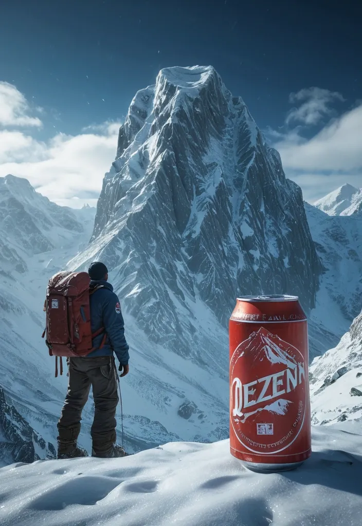 A monumental-scale , hyper-realistic photo of a colossal Queen fisher beer can towering over a vast , snow-covered mountain range , much like a mountain peak itself. In the foreground , a single , lone explorer with a large backpack stands with their back to the camera , staring up at the titanic structure. The red can features the classic white "Queen fisher" script logo and is partially covered in frost , snow , and ice , seamlessly integrating with the rugged , icy rock of the surrounding mountain range. The entire landscape is a sprawling , snow-laden valley under a dark , dramatic , cold blue sky filled with a flurry of fine , falling snow. Atmospheric perspective enhances the sense of awe and scale. Crisp , hyper-detailed textures on the metal , the explorer's clothing , the backpack , and the rugged , icy terrain. Dramatic , cool-toned cinematic lighting with deep shadows and soft , scattered light from the snowy atmosphere. Shot from a slightly low angle to emphasize the titanic scale. High resolution , 8k ,