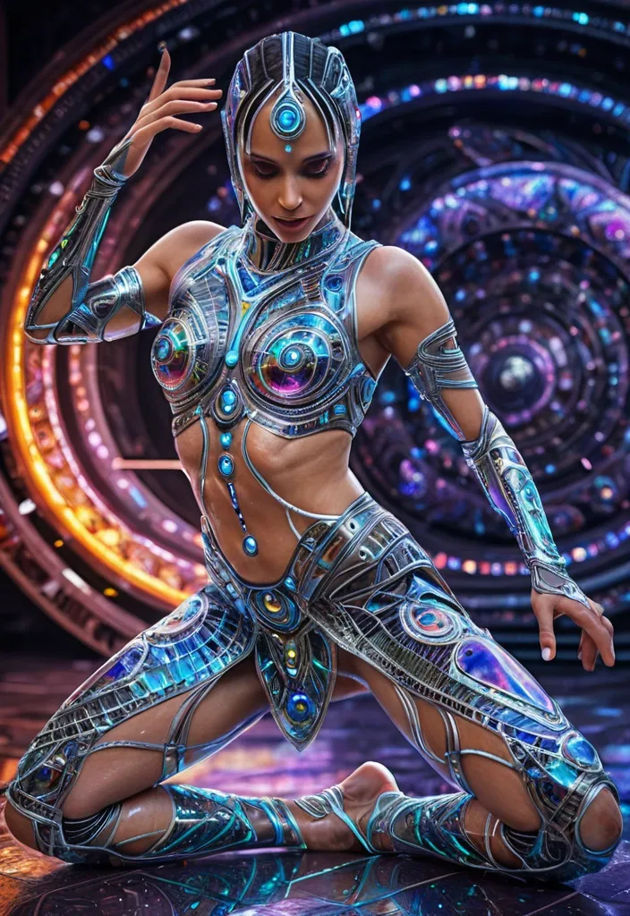 Whole body , solo , outstanding woman , futuristic female dancer in a (intricate futuristic belly dance clothing , Revealing clothing) , ((sweaty , dancing , dynamic pose , perfect body dancer costume , perfect anatomy , anatomically correct , )) , beautiful thin medium hair , hair fluttering , detailed hair depiction , face , perfect beautiful face , makeup , smile , detailed skin , fair skin , Barefoot (((show feet))) (detailed futuristic iridescent dancer outfit , intricate designed costume , complex patterns , spangles , vibrant colors , beautiful decorations) , detailed depictions of background , futuristic , intricate backgrounds , ((best quality , 8k , highres , masterpiece:1.2) , ultra-detailed , (realistic , photorealistic , photo-realistic:1.37) , HDR , UHD , incredibly absurdres , studio lighting , ultra-fine painting , sharp focus , physically-based rendering , extreme hyper detail descriptions in the artwork , professional , vivid colors , perfect anatomy) , ,