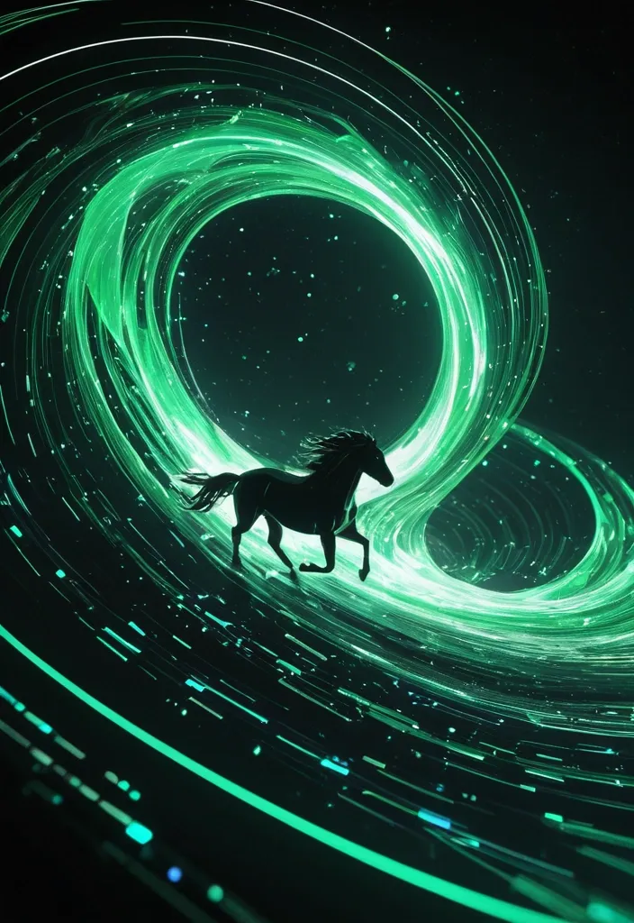 A Black hole depicted in an Abstract graphic Interference style , with swirling lines patterns and dynamic light motion speed effects. The holographic elements should create a sense of movement and energy with Horse on green code landscape , motion speed , flowing lines of luminous green code , driving through a stylized , abstract landscape. The 'track' is a stream of scrolling binary , pixelated structures. Style: Celestial , ethereal , abstract , digital art black Lighting: Dramatic backlighting , bright glowing particles , contrasting dark background Composition: dynamic diagonal , composition , upward gaze Details: Sparkling water waves and smoke , streaking white light trails , sense of movement and wonder , magical atmosphere Quality: High detail , 4K , Masterpiece , Rendered in Octane. ,
