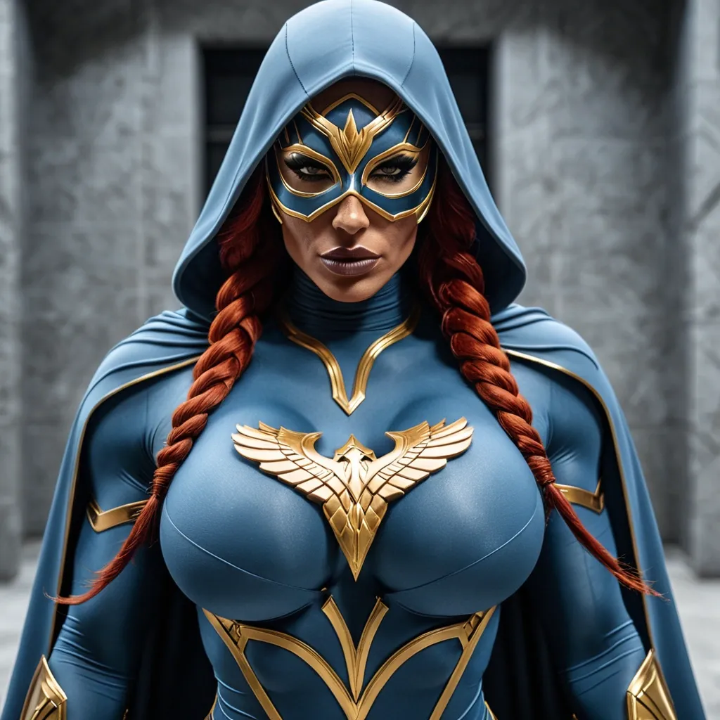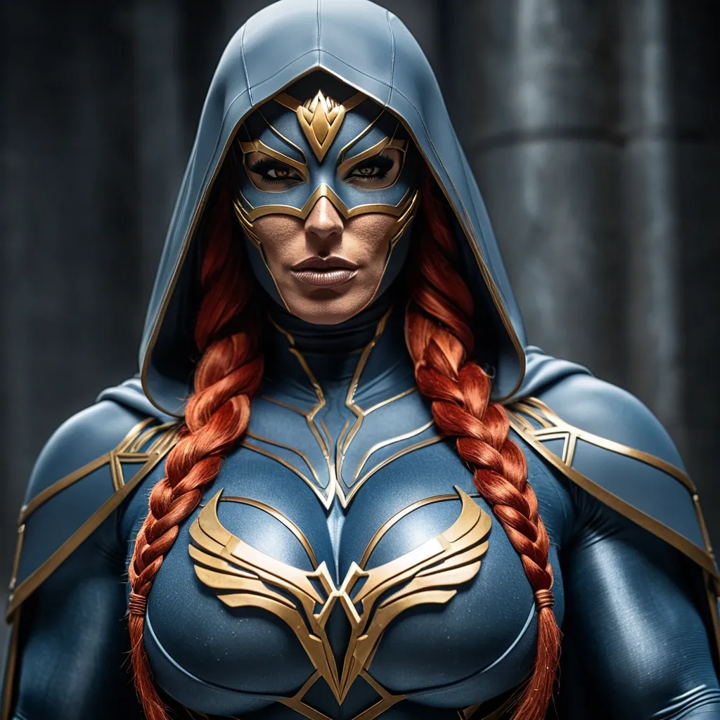 Generate Gorgeous female boss , bimbo , hourglass body , abnormally massive female bodybuilder , gorgeous , close up , full lips , big booty , redheaded , freckles on face and breast , braided design hair , feminine silhouette , too big breast , big booty , sexy thighs abs , silhouette , up close , flexing biceps , beautiful green eyes , legs are iconic and defining physical feature , both visually and in terms of combat ability.wearing an outfit that is a striking blend of elegance , power , and femininity , designed to command attention in any room. The suit is tailored to perfection , hugging the wearer’s curves with precision while emphasizing a structured silhouette. The fabric itself is a refined grey tweed patterned with subtle white grid lines , giving the suit a texture that feels both sophisticated and modern. The blazer features broad blue lapels and gold button accents , adding a luxurious touch that elevates the look beyond typical business attire. The matching high-waisted trousers elongate the frame , further enhancing the poised and commanding effect of the ensemble.The styling choices amplify the boldness of the suit. The inner blouse is a silky , greybutton-down shirt that complements the tweed’s tone while introducing a softer , feminine balance to the sharp tailoring of the jacket. The blouse peeks out neatly from under the blazer , maintaining elegance without drawing focus away from the suit’s commanding cut. Accessories are kept minimal yet intentional: a delicate layered gold necklace and hoop earrings that add glimmers of light and luxury without overpowering the outfit. The choice of voluminous , honey-brown braids cascading down her shoulders frames the face with both confidence and glamour , completing the commanding visual.Altogether , this look communicates a blend of authority and allure. It is business-ready yet fashion-forward , balancing corporate structure with vibrant femininity. The color palette blue , grey and gold avoids being overly delicate , instead embracing the richness of texture , structure , and presence. This is the kind of ensemble that speaks to ambition , sophistication , and personal style—ideal for someone who thrives in positions of influence but insists on expressing her individuality with bold elegance. It’s not just clothing—it’s a statement of power wrapped in grace. In luxury living legs that could crush a watermelon , skirt high boots are a bold and striking statement piece , crafted in glossy black patent leather that gives them a sleek , polished finish. Rising to just below the knee , the boots feature three adjustable buckle straps along the shaft , adding both edge and detail to their design. The towering stiletto heel , paired with a thick platform sole , creates an ultra-dramatic silhouette that elongates the leg and exudes power and confidence. With their combination of shine , height , and structure , these boots perfectly balance fierce femininity with high-fashion allure. Massive breast , massive cleavage , Up close shotThis powerhouse hourglass silhouetted female superhero wears a sleek , form-fitting grayish-blue bodysuit with intricate gold accents that highlight her powerful physique , complemented by a dramatic hooded cape that adds mystery and flowing movement. A distinctive half-mask conceals the upper portion of her face while leaving her determined expression visible , and the prominent golden eagle emblem on her chest symbolizes vigilance , freedom , and unyielding strength. Arms folded under chest ,
