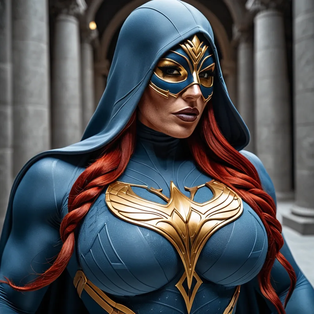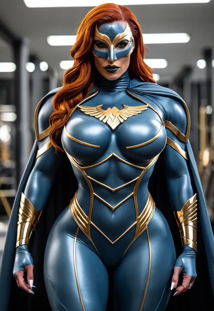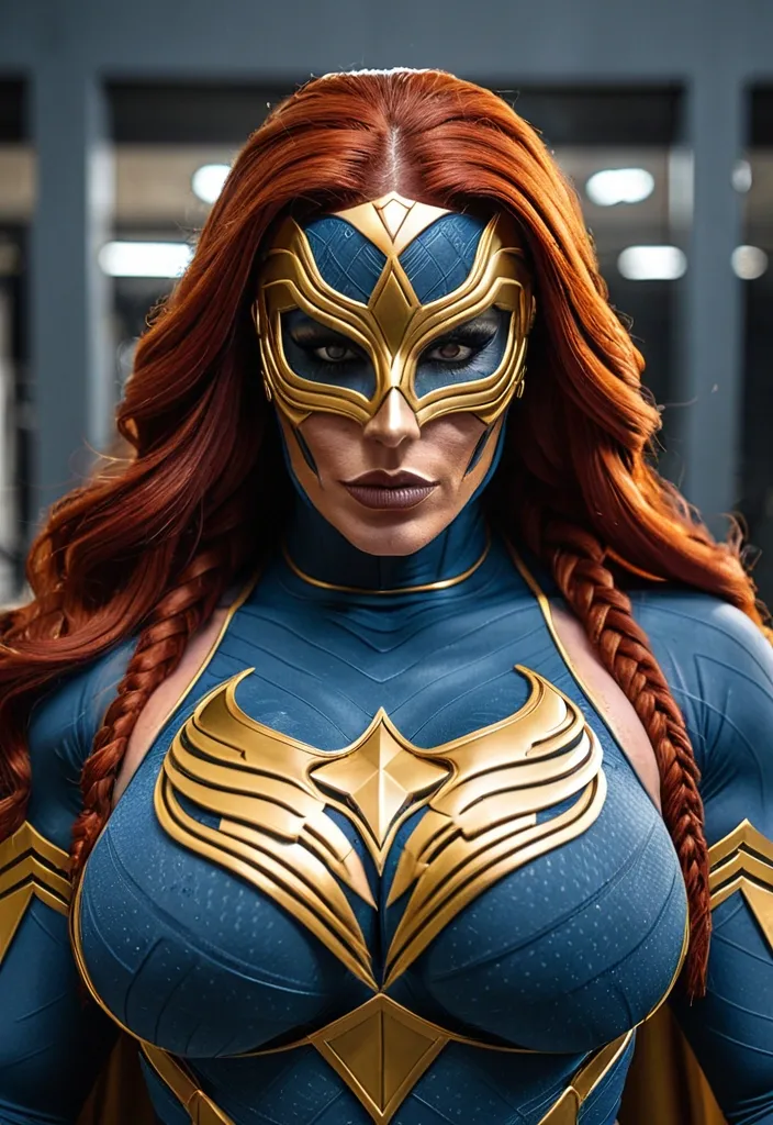 Generate Gorgeous female boss , bimbo , hourglass body , abnormally massive female bodybuilder , gorgeous , close up , full lips , big booty , redheaded , freckles on face and breast , braided design hair , feminine silhouette , too big breast , big booty , sexy thighs abs , silhouette , up close , flexing biceps , beautiful green eyes , legs are iconic and defining physical feature , both visually and in terms of combat ability.wearing an outfit that is a striking blend of elegance , power , and femininity , designed to command attention in any room. The suit is tailored to perfection , hugging the wearer’s curves with precision while emphasizing a structured silhouette. The fabric itself is a refined grey tweed patterned with subtle white grid lines , giving the suit a texture that feels both sophisticated and modern. The blazer features broad blue lapels and gold button accents , adding a luxurious touch that elevates the look beyond typical business attire. The matching high-waisted trousers elongate the frame , further enhancing the poised and commanding effect of the ensemble.The styling choices amplify the boldness of the suit. The inner blouse is a silky , greybutton-down shirt that complements the tweed’s tone while introducing a softer , feminine balance to the sharp tailoring of the jacket. The blouse peeks out neatly from under the blazer , maintaining elegance without drawing focus away from the suit’s commanding cut. Accessories are kept minimal yet intentional: a delicate layered gold necklace and hoop earrings that add glimmers of light and luxury without overpowering the outfit. The choice of voluminous , honey-brown braids cascading down her shoulders frames the face with both confidence and glamour , completing the commanding visual.Altogether , this look communicates a blend of authority and allure. It is business-ready yet fashion-forward , balancing corporate structure with vibrant femininity. The color palette blue , grey and gold avoids being overly delicate , instead embracing the richness of texture , structure , and presence. This is the kind of ensemble that speaks to ambition , sophistication , and personal style—ideal for someone who thrives in positions of influence but insists on expressing her individuality with bold elegance. It’s not just clothing—it’s a statement of power wrapped in grace. In luxury living legs that could crush a watermelon , skirt high boots are a bold and striking statement piece , crafted in glossy black patent leather that gives them a sleek , polished finish. Rising to just below the knee , the boots feature three adjustable buckle straps along the shaft , adding both edge and detail to their design. The towering stiletto heel , paired with a thick platform sole , creates an ultra-dramatic silhouette that elongates the leg and exudes power and confidence. With their combination of shine , height , and structure , these boots perfectly balance fierce femininity with high-fashion allure. Massive breast , massive cleavage , Up close shotThis powerhouse hourglass silhouetted female superhero wears a sleek , form-fitting grayish-blue bodysuit with intricate gold accents that highlight her powerful physique , complemented by a dramatic hooded cape that adds mystery and flowing movement. A distinctive half-mask conceals the upper portion of her face while leaving her determined expression visible , and the prominent golden eagle emblem on her chest symbolizes vigilance , freedom , and unyielding strength. Massive cleavage ,