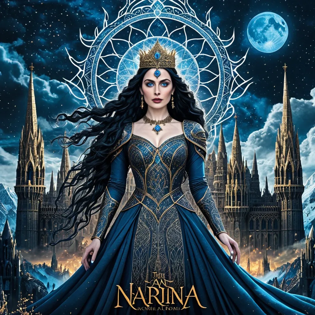A surreal dreamlike Bollywood cover poster of a majestic Queen Lucy (the Valiant , the youngest Pevensie child and a Queen of Narnia during the Golden Age) with striking blue eyes standing with giant Lion made of swirling Black and dark-gray clouds , intricate fractal circuit patterns covering skin and sapphire blue , ultra-detailed ornate baroque style , crescent moon crown glowing softly , long flowing hair transforming into a golden ethereal city of towering gothic spires and cathedrals floating in the sky , dark starry night sky , mystical atmosphere. the poster text "The Chronicles of Narnia". ,