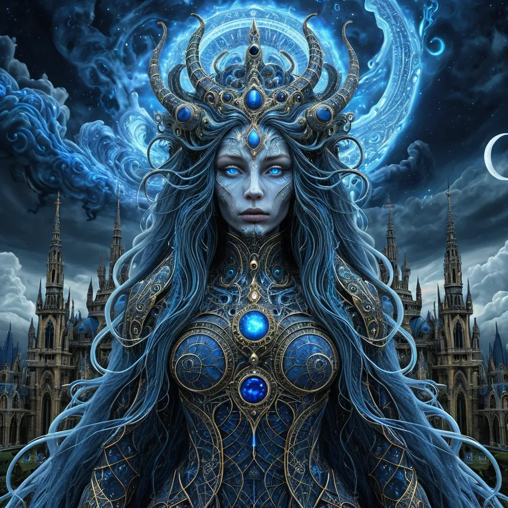 A surreal dreamlike portrait of a majestic queen with striking blue eyes riding on giant Black panther made of swirling Black and dark-blue clouds , his serene profile facing right , with striking blue eyes , intricate fractal circuit patterns covering skin and sapphire blue , ultra-detailed ornate baroque style , crescent moon crown glowing softly , long flowing hair transforming into a golden ethereal city of towering gothic spires and cathedrals floating in the sky , dark starry night sky , mystical atmosphere. Style: Celestial , ethereal , abstract , digital art smoking: Dramatic backlighting , bright glowing particles , contrasting dark background Composition: dynamic diagonal composition , upward gaze Details: Sparkling white waves and smoke , streaking blue light trails , sense of movement and wonder , magical atmosphere Quality: High detail , 4K , Masterpiece , Rendered in Octane ,