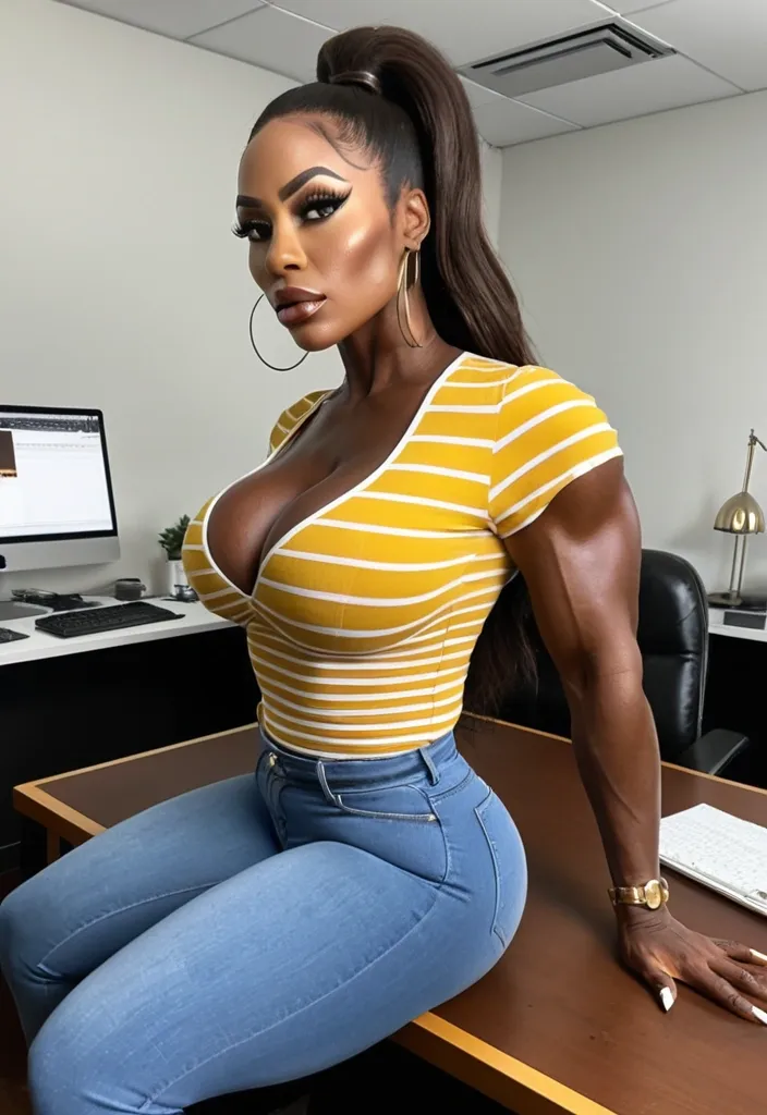 Generate Gorgeous 37 years old , female boss , dark-skinned African-American woman , bimbo , hourglass body , abnormally massive female bodybuilder , gorgeous , close up , full lips , big booty , brown , ponytail , bangs , coarse hair , , feminine silhouette , too big breast , big booty , sexy thighs abs , silhouette , up close , flexing biceps , beautiful brown eyes , legs are iconic and defining physical feature , both visually and in terms of combat ability.wearing an outfit that is a striking blend of elegance , power , and femininity , designed to command attention in any room. The suit is tailored to perfection , hugging the wearer’s curves with precision while emphasizing a structured silhouette. The fabric itself is a refined grey tweed patterned with subtle white grid lines , giving the suit a texture that feels both sophisticated and modern. The blazer features broad blue lapels and gold button accents , adding a luxurious touch that elevates the look beyond typical business attire. The matching high-waisted trousers elongate the frame , further enhancing the poised and commanding effect of the ensemble.The styling choices amplify the boldness of the suit. The inner blouse is a silky , greybutton-down shirt that complements the tweed’s tone while introducing a softer , feminine balance to the sharp tailoring of the jacket. The blouse peeks out neatly from under the blazer , maintaining elegance without drawing focus away from the suit’s commanding cut. Accessories are kept minimal yet intentional: a delicate layered gold necklace and hoop earrings that add glimmers of light and luxury without overpowering the outfit. The choice of voluminous , honey-brown braids cascading down her shoulders frames the face with both confidence and glamour , completing the commanding visual.Altogether , this look communicates a blend of authority and allure. It is business-ready yet fashion-forward , balancing corporate structure with vibrant femininity. The color palette blue , grey and gold avoids being overly delicate , instead embracing the richness of texture , structure , and presence. This is the kind of ensemble that speaks to ambition , sophistication , and personal style—ideal for someone who thrives in positions of influence but insists on expressing her individuality with bold elegance. It’s not just clothing—it’s a statement of power wrapped in grace. In luxury living legs that could crush a watermelon , skirt high boots are a bold and striking statement piece , crafted in glossy black patent leather that gives them a sleek , polished finish. Rising to just below the knee , the boots feature three adjustable buckle straps along the shaft , adding both edge and detail to their design. The towering stiletto heel , paired with a thick platform sole , creates an ultra-dramatic silhouette that elongates the leg and exudes power and confidence. With their combination of shine , height , and structure , these boots perfectly balance fierce femininity with high-fashion allure. High cheekbones , prominent jawline , gorgeous big brown eyes , freckles , enormous breast , grey denim pants , yellow and blue horizontal striped v neck t- shirt , skirt , She is leaning forward aggressively toward the viewer , her elbows resting on a desk or table (out of frame) , which thrusts her chest prominently into the foreground and creates dramatic , as the open white blouse strains against her. The low camera angle combined with her wide , teasing l and tilted head gives the pose a arched back facing viewer yet deliberately provocative “leaning over the student’s desk” vibe classic to the fantasy trope.scowl on face. Enormous breast , enormous butt gorgeous brown eyes , stacked hourglass silhouette ,