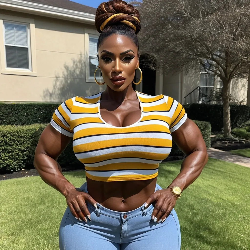 Generate Gorgeous 37 years old , female boss , dark-skinned African-American woman , bimbo , hourglass body , abnormally massive female bodybuilder , gorgeous , close up , full lips , big booty , brown , updo , feminine silhouette , too big breast , big booty , sexy thighs abs , silhouette , up close , flexing biceps , beautiful brown eyes , legs are iconic and defining physical feature , both visually and in terms of combat ability.wearing an outfit that is a striking blend of elegance , power , and femininity , designed to command attention in any room. The suit is tailored to perfection , hugging the wearer’s curves with precision while emphasizing a structured silhouette. The fabric itself is a refined grey tweed patterned with subtle white grid lines , giving the suit a texture that feels both sophisticated and modern. The blazer features broad blue lapels and gold button accents , adding a luxurious touch that elevates the look beyond typical business attire. The matching high-waisted trousers elongate the frame , further enhancing the poised and commanding effect of the ensemble.The styling choices amplify the boldness of the suit. The inner blouse is a silky , greybutton-down shirt that complements the tweed’s tone while introducing a softer , feminine balance to the sharp tailoring of the jacket. The blouse peeks out neatly from under the blazer , maintaining elegance without drawing focus away from the suit’s commanding cut. Accessories are kept minimal yet intentional: a delicate layered gold necklace and hoop earrings that add glimmers of light and luxury without overpowering the outfit. The choice of voluminous , honey-brown braids cascading down her shoulders frames the face with both confidence and glamour , completing the commanding visual.Altogether , this look communicates a blend of authority and allure. It is business-ready yet fashion-forward , balancing corporate structure with vibrant femininity. The color palette blue , grey and gold avoids being overly delicate , instead embracing the richness of texture , structure , and presence. This is the kind of ensemble that speaks to ambition , sophistication , and personal style—ideal for someone who thrives in positions of influence but insists on expressing her individuality with bold elegance. It’s not just clothing—it’s a statement of power wrapped in grace. In luxury living legs that could crush a watermelon , skirt high boots are a bold and striking statement piece , crafted in glossy black patent leather that gives them a sleek , polished finish. Rising to just below the knee , the boots feature three adjustable buckle straps along the shaft , adding both edge and detail to their design. The towering stiletto heel , paired with a thick platform sole , creates an ultra-dramatic silhouette that elongates the leg and exudes power and confidence. With their combination of shine , height , and structure , these boots perfectly balance fierce femininity with high-fashion allure. High cheekbones , prominent jawline , gorgeous big brown eyes , freckles , enormous breast , grey denim pants , yellow and blue horizontal striped v neck t- shirt , skirt , front yard gorgeous brown eyes , ,