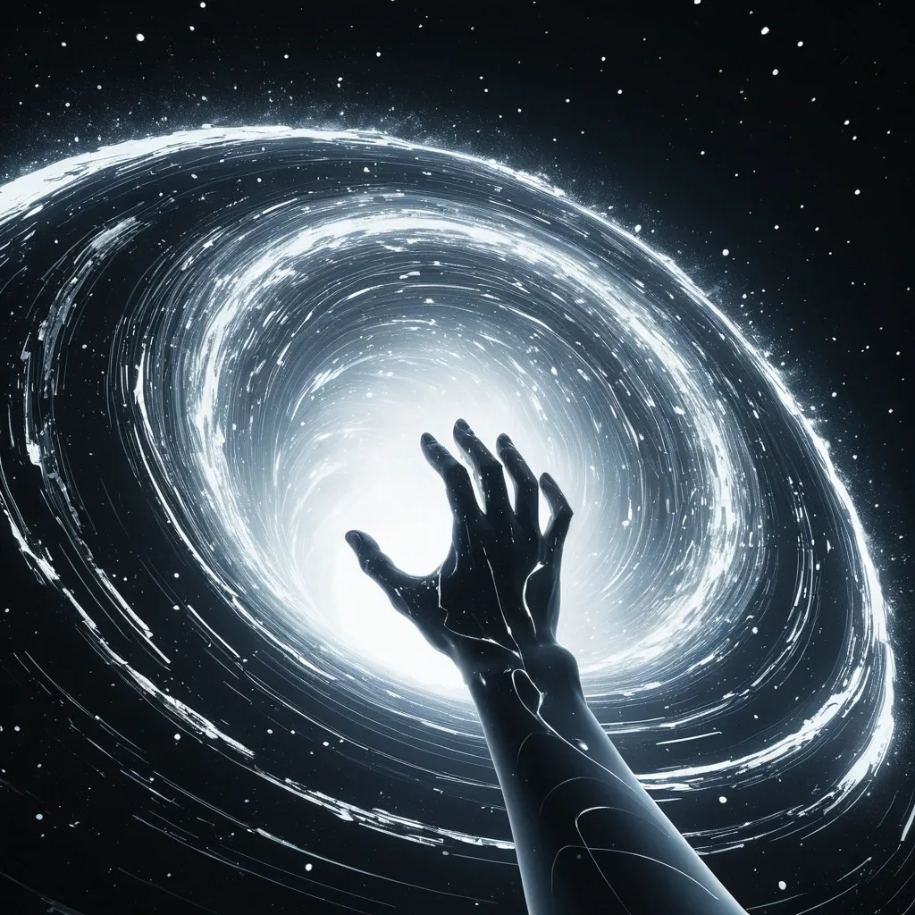 A human arm rises naturally upward from Vortex cosmic maze , landscape snow Melting from a black hole and make them fight but make the white hole is winning and it is a back cover to a story called the white hole and the black hole make the summary on the back , set against a low-resolution metallic black background with subtle snow accents. Style: Celestial , ethereal , abstract , digital art smoking: Dramatic backlighting , bright glowing particles , contrasting dark background Composition: dynamic diagonal composition , upward gaze Details: Sparkling white waves and smoke , streaking white light trails , sense of movement and wonder , magical atmosphere Quality: High detail , 4K , Masterpiece , Rendered in Octane. ,