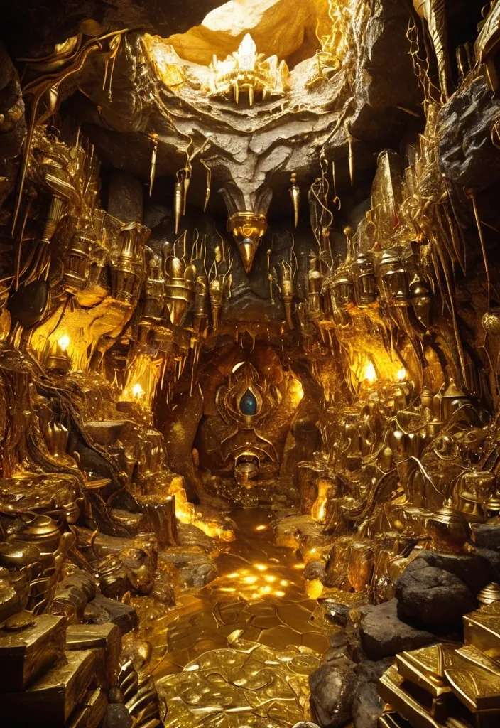 top down cave , filled with more treasures than the cave of Aladdin , gold , magical weapons , shields , gems , piles and piles from floor to the walls. on the walls themselves , veins of molten gold , are branching up into the ceiling. veins and shallow rivers and pools of molten gold divide the rooms and piles of gold into 5 sections. ,