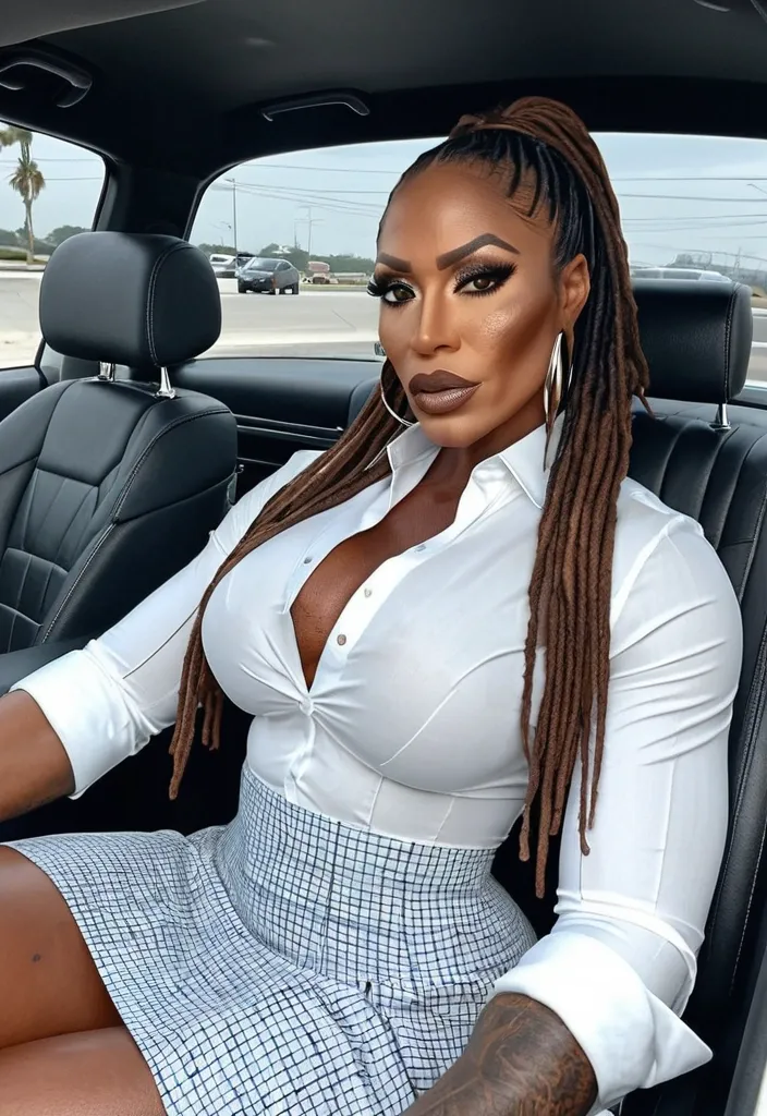 Generate Gorgeous 42 years old , female boss , dark-skinned African-American woman , bimbo , hourglass body , abnormally massive female bodybuilder , gorgeous , close up , full lips , big booty , brown , dreadlocks feminine silhouette , too big breast , big booty , sexy thighs abs , silhouette , up close , flexing biceps , beautiful brown eyes , legs are iconic and defining physical feature , both visually and in terms of combat ability.wearing an outfit that is a striking blend of elegance , power , and femininity , designed to command attention in any room. The suit is tailored to perfection , hugging the wearer’s curves with precision while emphasizing a structured silhouette. The fabric itself is a refined grey tweed patterned with subtle white grid lines , giving the suit a texture that feels both sophisticated and modern. The blazer features broad blue lapels and gold button accents , adding a luxurious touch that elevates the look beyond typical business attire. The matching high-waisted trousers elongate the frame , further enhancing the poised and commanding effect of the ensemble.The styling choices amplify the boldness of the suit. The inner blouse is a silky , greybutton-down shirt that complements the tweed’s tone while introducing a softer , feminine balance to the sharp tailoring of the jacket. The blouse peeks out neatly from under the blazer , maintaining elegance without drawing focus away from the suit’s commanding cut. Accessories are kept minimal yet intentional: a delicate layered gold necklace and hoop earrings that add glimmers of light and luxury without overpowering the outfit. The choice of voluminous , honey-brown braids cascading down her shoulders frames the face with both confidence and glamour , completing the commanding visual.Altogether , this look communicates a blend of authority and allure. It is business-ready yet fashion-forward , balancing corporate structure with vibrant femininity. The color palette blue , grey and gold avoids being overly delicate , instead embracing the richness of texture , structure , and presence. This is the kind of ensemble that speaks to ambition , sophistication , and personal style—ideal for someone who thrives in positions of influence but insists on expressing her individuality with bold elegance. It’s not just clothing—it’s a statement of power wrapped in grace. In luxury living legs that could crush a watermelon , skirt high boots are a bold and striking statement piece , crafted in glossy black patent leather that gives them a sleek , polished finish. Rising to just below the knee , the boots feature three adjustable buckle straps along the shaft , adding both edge and detail to their design. The towering stiletto heel , paired with a thick platform sole , creates an ultra-dramatic silhouette that elongates the leg and exudes power and confidence. With their combination of shine , height , and structure , these boots perfectly balance fierce femininity with high-fashion allure. High cheekbones , prominent jawline , gorgeous big brown eyes , freckles , enormous breast , burnt white oxford shirt , with blue patterned grid lines design , gray skirt , sitting in backseat of car ,