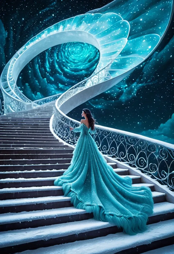 A stunning ethereal scene unfolds with a young woman standing gracefully on a shimmering , ice-like staircase that spirals upward into a starry night sky , surrounded by fluffy clouds. Dressed in a flowing turquoise gown that catches the light , she gazes upward in a moment of wonder as a colossal , iridescent butterfly hovers majestically above her , its delicate wings reflecting shades of purple and blue. The backdrop features a cosmic expanse dotted with stars , enhancing the dreamlike quality of the environment , while the luminous staircase seems to invite an enchanting journey into the heavens. ,
