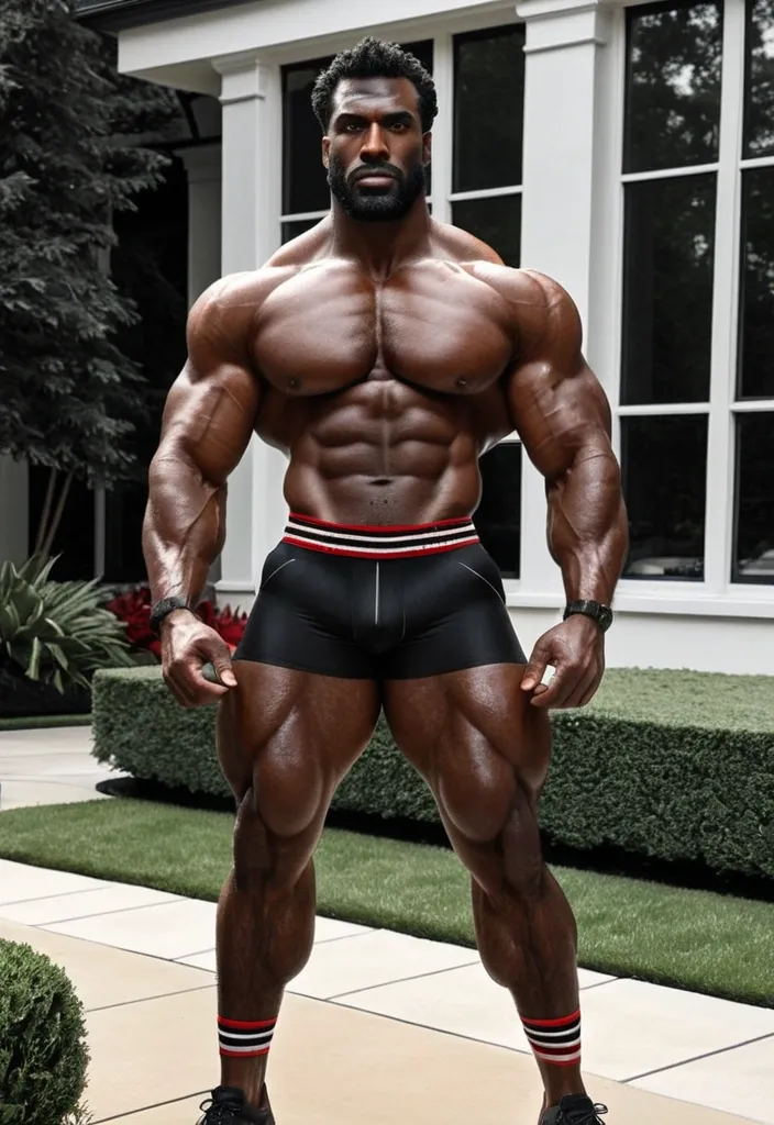 Generate ruggedly handsome dark-skinned African-American man abnormally massive male bodybuilder , 1940s coarse hair , a park down the middle of hair , close up , full lips , big booty , black trimmed coarse hair , big , muscular man , brown strikingly intense and alluring eyes , up close , flexing biceps , beautiful brown eyes , legs are iconic and defining physical feature , both visually and in terms of combat ability.wearing an outfit that is a striking blend of elegance , power , and femininity , designed to command attention in any room. The suit is tailored to perfection , hugging the wearer’s curves with precision while emphasizing a structured silhouette. The fabric itself is a refined grey tweed patterned with subtle white grid lines , giving the suit a texture that feels both sophisticated and modern. The blazer features broad blue lapels and gold button accents , adding a luxurious touch that elevates the look beyond typical business attire. The matching high-waisted trousers elongate the frame , further enhancing the poised and commanding effect of the ensemble.The styling choices amplify the boldness of the suit. The inner shirt is a silky , greybutton-down shirt that complements the tweed’s tone while introducing a masculine balance to the sharp tailoring of the jacket. The shirt peeks out neatly from under the blazer , maintaining elegance without drawing focus away from the suit’s commanding cut. Accessories are kept minimal yet intentional: a delicate layered gold necklace ad alpha leader of light and luxury without overpowering the outfit completing the commanding visual.Altogether , this look communicates a blend of authority and allure. It is business-ready yet fashion-forward , balancing corporate structure with vibrant femininity. The color palette blue , grey and gold avoids being overly delicate , instead embracing the richness of texture , structure , and presence. This is the kind of ensemble that speaks to ambition , sophistication , and personal style—ideal for someone who thrives in positions of influence but insists on expressing her individuality with bold elegance. It’s not just clothing—it’s a statement of power wrapped in grace. In luxury living legs that could crush a watermelon , skirt high boots are a bold and striking statement piece , crafted in glossy black patent leather that gives them a sleek , polished finish. Rising to just below the knee , the boots feature three adjustable buckle straps along the shaft , adding both edge and detail to their design. The towering stiletto heel , paired with a thick platform sole , creates an ultra-dramatic silhouette that elongates the leg and exudes power and confidence. With their combination of shine , height , and structure , these boots perfectly balance fierce femininity with high-fashion allure , wearinfg a wearing a black and red and white striped tank top and black pants , standing in a beautiful gorgeous art deco ba living room with large windows and a beautiful suburban neighborhood , black and red and white striped tank top , tank top ,