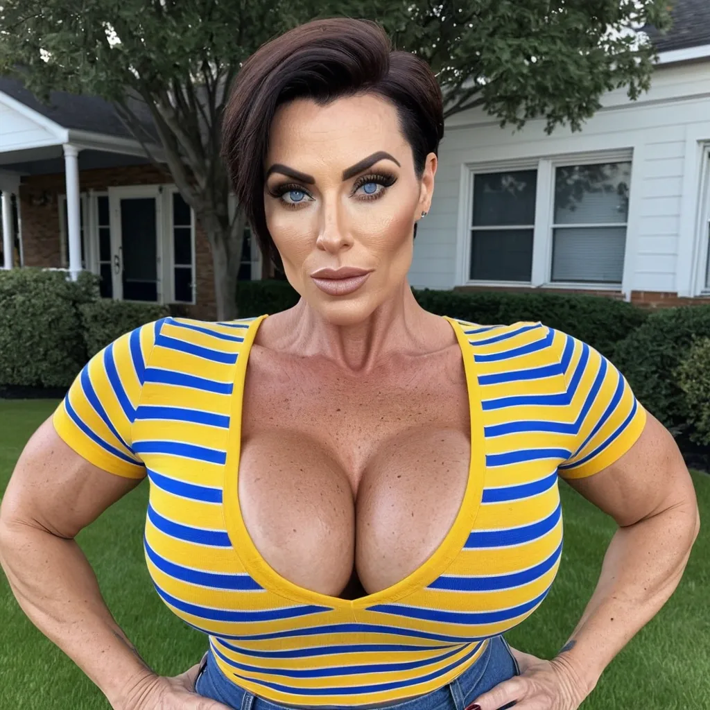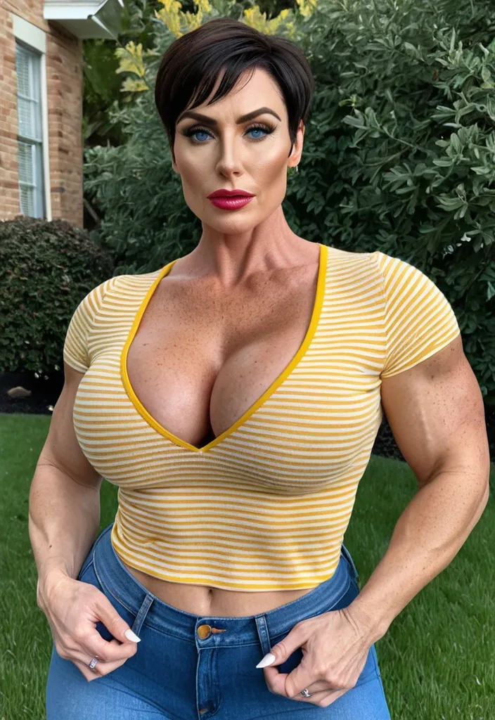 Generate Gorgeous 37 years old , female boss , Caucasian woman , bimbo , hourglass body , abnormally massive female bodybuilder , freckles , gorgeous , close up , full lips , big bootydark , brown , short pixie hair , feminine silhouette , too big breast , big booty , sexy thighs abs , silhouette , up close , flexing biceps , gorgeous blue eyes , legs are iconic and defining physical feature , both visually and in terms of combat ability.wearing an outfit that is a striking blend of elegance , power , and femininity , designed to command attention in any room. The suit is tailored to perfection , hugging the wearer’s curves with precision while emphasizing a structured silhouette. The fabric itself is a refined grey tweed patterned with subtle white grid lines , giving the suit a texture that feels both sophisticated and modern. The blazer features broad blue lapels and gold button accents , adding a luxurious touch that elevates the look beyond typical business attire. The matching high-waisted trousers elongate the frame , further enhancing the poised and commanding effect of the ensemble.The styling choices amplify the boldness of the suit. The inner blouse is a silky , greybutton-down shirt that complements the tweed’s tone while introducing a softer , feminine balance to the sharp tailoring of the jacket. The blouse peeks out neatly from under the blazer , maintaining elegance without drawing focus away from the suit’s commanding cut. Accessories are kept minimal yet intentional: a delicate layered gold necklace and hoop earrings that add glimmers of light and luxury without overpowering the outfit. The choice of voluminous , honey-brown braids cascading down her shoulders frames the face with both confidence and glamour , completing the commanding visual.Altogether , this look communicates a blend of authority and allure. It is business-ready yet fashion-forward , balancing corporate structure with vibrant femininity. The color palette blue , grey and gold avoids being overly delicate , instead embracing the richness of texture , structure , and presence. This is the kind of ensemble that speaks to ambition , sophistication , and personal style—ideal for someone who thrives in positions of influence but insists on expressing her individuality with bold elegance. It’s not just clothing—it’s a statement of power wrapped in grace. In luxury living legs that could crush a watermelon , skirt high boots are a bold and striking statement piece , crafted in glossy black patent leather that gives them a sleek , polished finish. Rising to just below the knee , the boots feature three adjustable buckle straps along the shaft , adding both edge and detail to their design. The towering stiletto heel , paired with a thick platform sole , creates an ultra-dramatic silhouette that elongates the leg and exudes power and confidence. With their combination of shine , height , and structure , these boots perfectly balance fierce femininity with high-fashion allure. High cheekbones , prominent jawline , gorgeous big blue eyes , enormous breast , grey denim pants , freckles , yellow and blue horizontal striped v neck t- shirt , skirt , front yard gorgeous blue eyes , massive breast , enormous butt , stacked , massive breas ,
