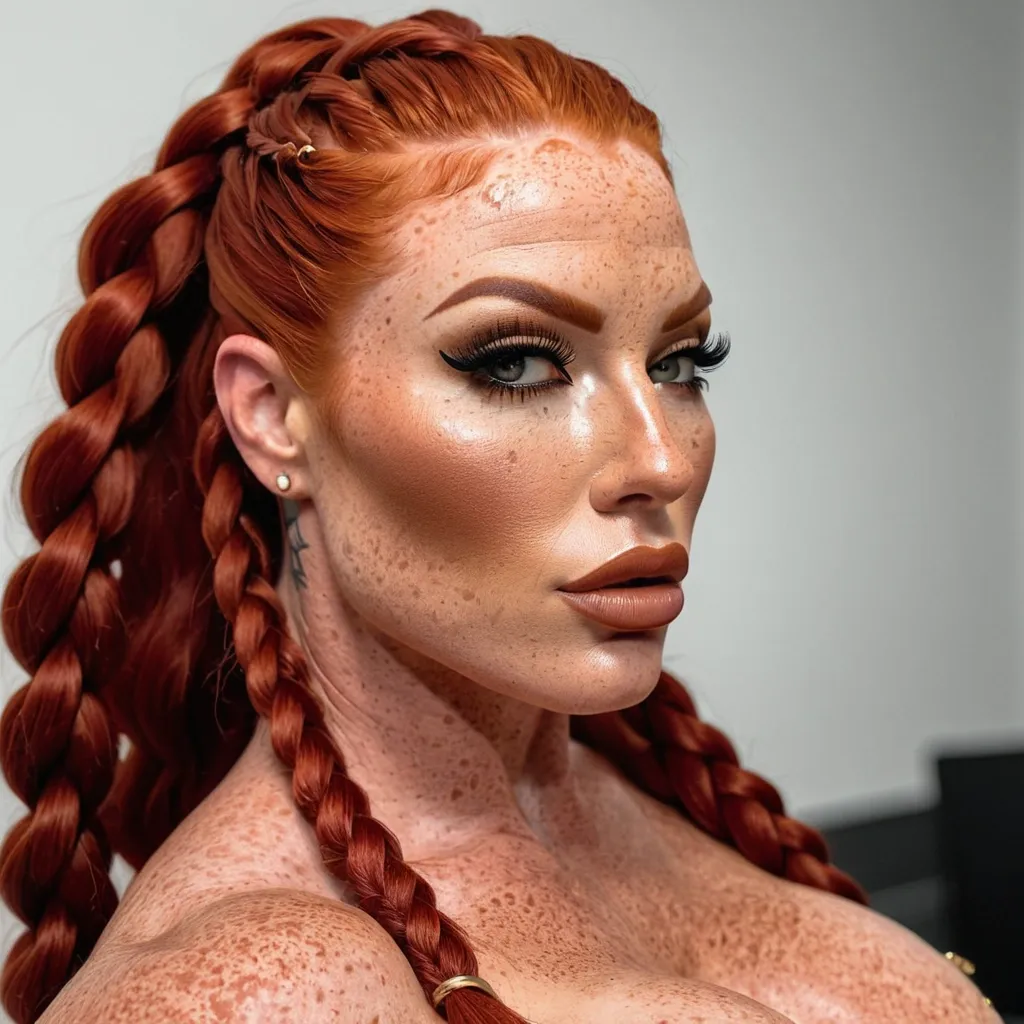 Generate Gorgeous female boss , bimbo , hourglass body , abnormally massive female bodybuilder , gorgeous , close up , full lips , big booty , redheaded , freckles on face and breast , braided design hair , feminine silhouette , too big breast , big booty , sexy thighs abs , silhouette , up close , flexing biceps , beautiful green eyes , legs are iconic and defining physical feature , both visually and in terms of combat ability.wearing an outfit that is a striking blend of elegance , power , and femininity , designed to command attention in any room. The suit is tailored to perfection , hugging the wearer’s curves with precision while emphasizing a structured silhouette. The fabric itself is a refined grey tweed patterned with subtle white grid lines , giving the suit a texture that feels both sophisticated and modern. The blazer features broad blue lapels and gold button accents , adding a luxurious touch that elevates the look beyond typical business attire. The matching high-waisted trousers elongate the frame , further enhancing the poised and commanding effect of the ensemble.The styling choices amplify the boldness of the suit. The inner blouse is a silky , greybutton-down shirt that complements the tweed’s tone while introducing a softer , feminine balance to the sharp tailoring of the jacket. The blouse peeks out neatly from under the blazer , maintaining elegance without drawing focus away from the suit’s commanding cut. Accessories are kept minimal yet intentional: a delicate layered gold necklace and hoop earrings that add glimmers of light and luxury without overpowering the outfit. The choice of voluminous , honey-brown braids cascading down her shoulders frames the face with both confidence and glamour , completing the commanding visual.Altogether , this look communicates a blend of authority and allure. It is business-ready yet fashion-forward , balancing corporate structure with vibrant femininity. The color palette blue , grey and gold avoids being overly delicate , instead embracing the richness of texture , structure , and presence. This is the kind of ensemble that speaks to ambition , sophistication , and personal style—ideal for someone who thrives in positions of influence but insists on expressing her individuality with bold elegance. It’s not just clothing—it’s a statement of power wrapped in grace. In luxury living legs that could crush a watermelon , skirt high boots are a bold and striking statement piece , crafted in glossy black patent leather that gives them a sleek , polished finish. Rising to just below the knee , the boots feature three adjustable buckle straps along the shaft , adding both edge and detail to their design. The towering stiletto heel , paired with a thick platform sole , creates an ultra-dramatic silhouette that elongates the leg and exudes power and confidence. With their combination of shine , height , and structure , these boots perfectly balance fierce femininity with high-fashion allure. abnormally massive female bodybuilder , gorgeous , close up , full lips , big booty , redheaded , freckles on face and breast , braided design hair , ,