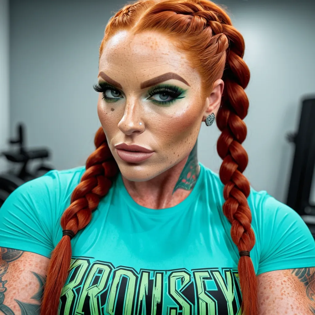 Generate Gorgeous female boss , bimbo , hourglass body , abnormally massive female bodybuilder , gorgeous , close up , full lips , big booty , redheaded , freckles on face and breast , braided design hair , feminine silhouette , too big breast , big booty , sexy thighs abs , silhouette , up close , flexing biceps , beautiful green eyes , legs are iconic and defining physical feature , both visually and in terms of combat ability.wearing an outfit that is a striking blend of elegance , power , and femininity , designed to command attention in any room. The suit is tailored to perfection , hugging the wearer’s curves with precision while emphasizing a structured silhouette. The fabric itself is a refined grey tweed patterned with subtle white grid lines , giving the suit a texture that feels both sophisticated and modern. The blazer features broad blue lapels and gold button accents , adding a luxurious touch that elevates the look beyond typical business attire. The matching high-waisted trousers elongate the frame , further enhancing the poised and commanding effect of the ensemble.The styling choices amplify the boldness of the suit. The inner blouse is a silky , greybutton-down shirt that complements the tweed’s tone while introducing a softer , feminine balance to the sharp tailoring of the jacket. The blouse peeks out neatly from under the blazer , maintaining elegance without drawing focus away from the suit’s commanding cut. Accessories are kept minimal yet intentional: a delicate layered gold necklace and hoop earrings that add glimmers of light and luxury without overpowering the outfit. The choice of voluminous , honey-brown braids cascading down her shoulders frames the face with both confidence and glamour , completing the commanding visual.Altogether , this look communicates a blend of authority and allure. It is business-ready yet fashion-forward , balancing corporate structure with vibrant femininity. The color palette blue , grey and gold avoids being overly delicate , instead embracing the richness of texture , structure , and presence. This is the kind of ensemble that speaks to ambition , sophistication , and personal style—ideal for someone who thrives in positions of influence but insists on expressing her individuality with bold elegance. It’s not just clothing—it’s a statement of power wrapped in grace. In luxury living legs that could crush a watermelon , skirt high boots are a bold and striking statement piece , crafted in glossy black patent leather that gives them a sleek , polished finish. Rising to just below the knee , the boots feature three adjustable buckle straps along the shaft , adding both edge and detail to their design. The towering stiletto heel , paired with a thick platform sole , creates an ultra-dramatic silhouette that elongates the leg and exudes power and confidence. With their combination of shine , height , and structure , these boots perfectly balance fierce femininity with high-fashion allure.greenish blue abstract shaped t-shirt ,