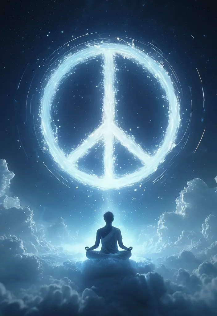 A text "A" is solitary figure meditating on The Title big text "PEACE" in floating cloud shape , vortex mist , bathed in a white aura of protective night light. Below , a vast , calm space stretches to the horizon under a clear , soft blue sky. The art style is ethereal fantasy concept art , with soft edges , a luminous night glow , and a palette of soothing pastels. Style: Celestial , ethereal , abstract , digital art Lighting: Dramatic backlighting , bright glowing particles , contrasting dark background Composition: dynamic diagonal composition , upward gaze Details: Sparkling dark waves and smoke , streaking white light trails , sense of movement and wonder , meditation atmosphere Quality: High detail , 4K , Masterpiece , Rendered in Octane ,